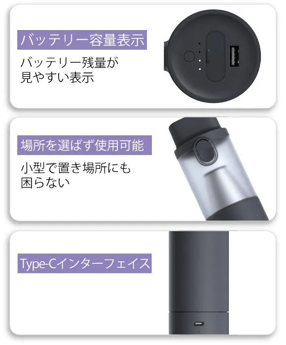 ワイヤレスでちょっとした汚れもすぐに掃除でき、車内を清潔に保つ、お掃除の頼れるパートナーです。