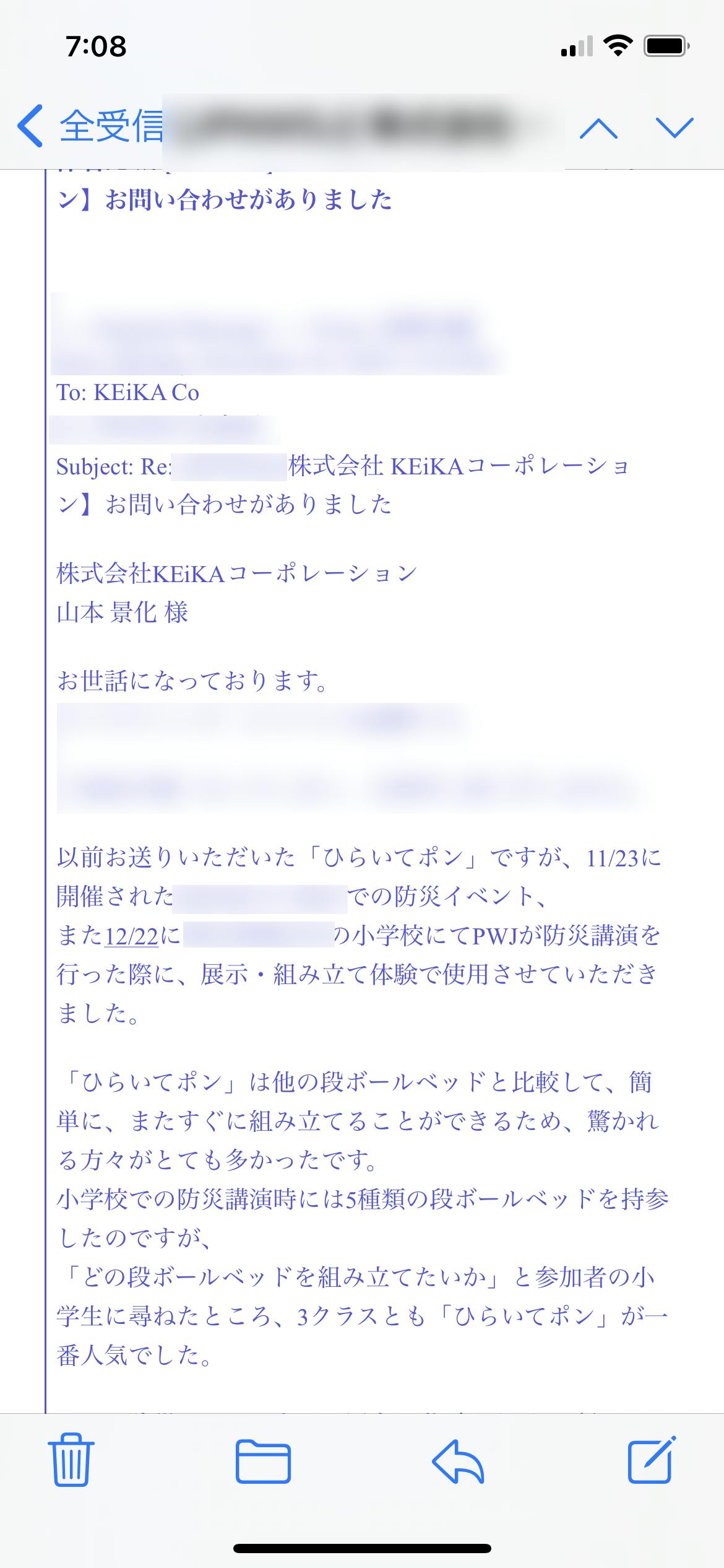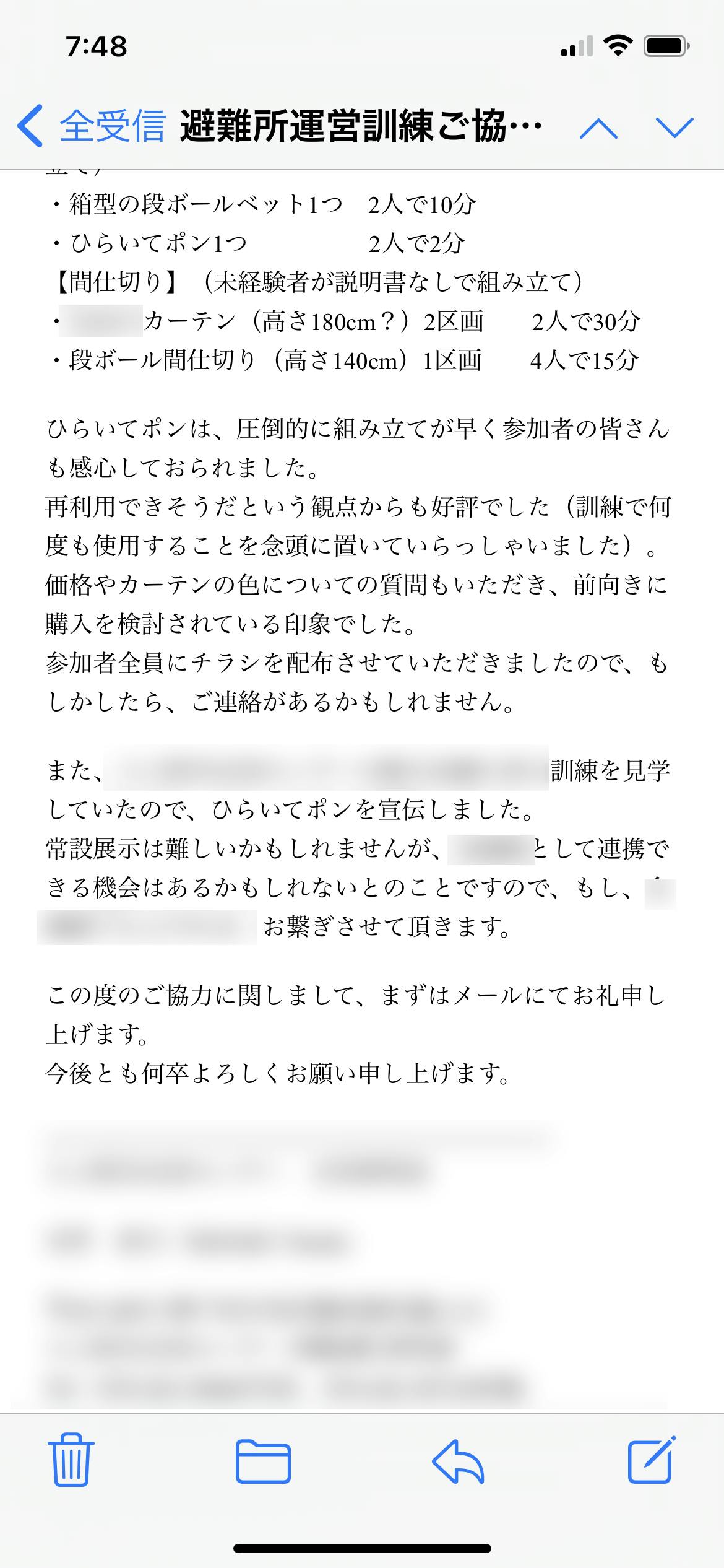冒頭にご説明させて頂きましたが、災害が起きた時の為にまずは身近な長田区を始め、神戸市の各避難所に1分で組立られる「段ボールベッド ひらいてポン」を備蓄して欲しいと考えており、まずは長田区のふたば学舎様に「段ボールベッド ひらいてポン」を無償で送り、万が一の為、備蓄して頂きます。