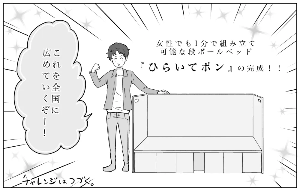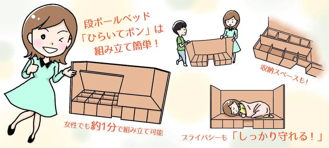 ひらいてポンは、将来的に起こるであろう地震だけではなく、毎年来る台風や水害に備えるため、組立簡単なダンボールベッドを提供することにより、災害発生時の避難者の生活環境を向上させる事に貢献したいと思い、試行錯誤の上、約1分で簡単に組み立てできる簡易ベットを開発しました。