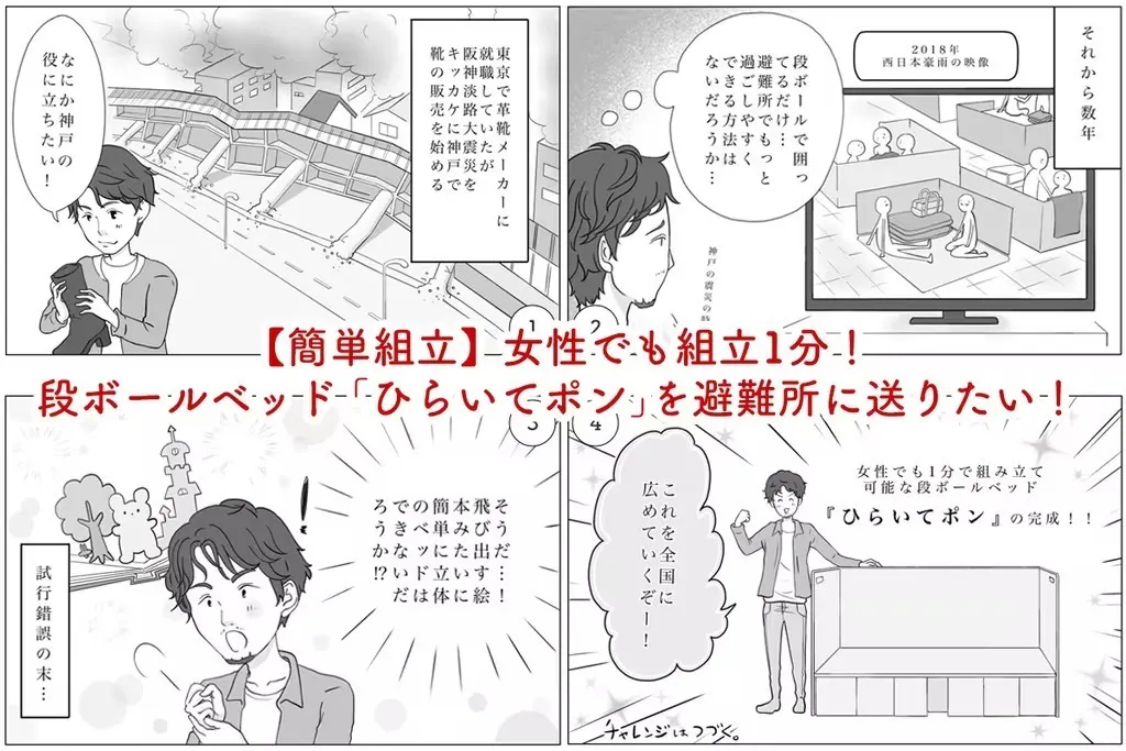 万が一災害が起きた時の為にまずは身近な長田区を始め、神戸市の各避難所に1分で組立られる「段ボールベッド ひらいてポン」を備蓄して欲しいと考え、今回のクラウドファンディングにチャレンジ致しました!