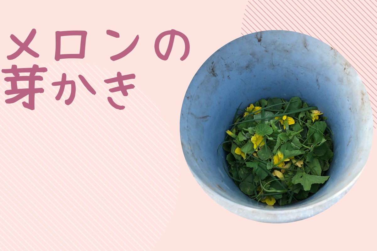 よりメロンを成長させるため、伸び放題になった枝やツルは日当たりや風通しを阻害し病気や害虫をよぶのでメロンの芽をかく(摘む)作業を芽かきと言います。