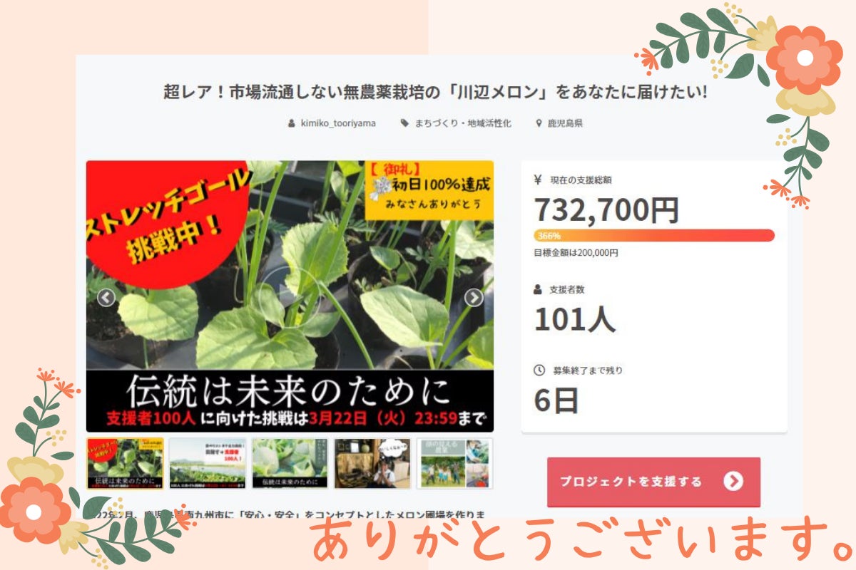 ありがとうございます。ストレッチGoalは達成しましたが、「より多くの人に川辺のメロンを知ってもらう」というミッションは未来永劫続きます。