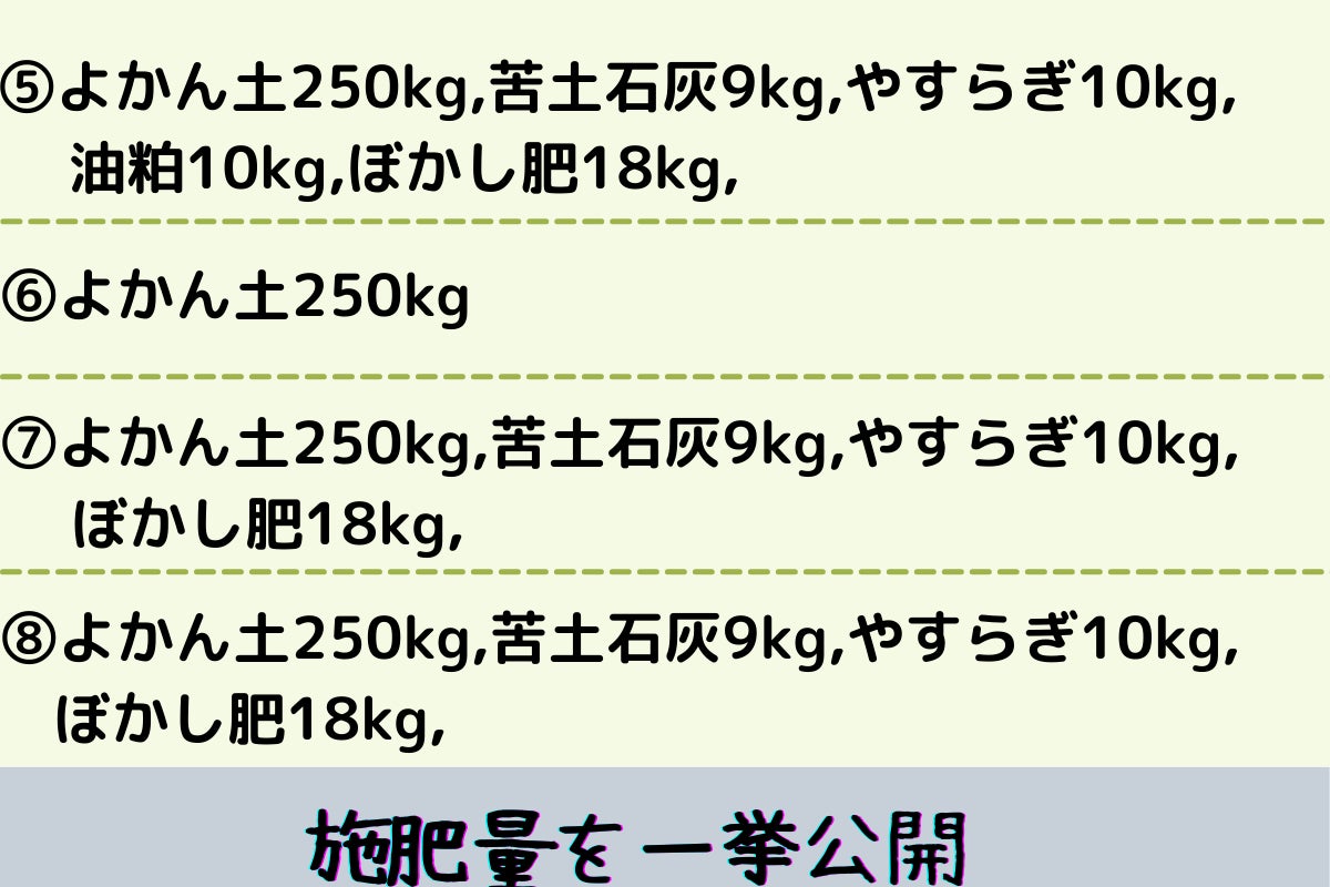 日置市の生ごみたい肥(よかん土)のみを使った列もあれば、JAなどで推奨される施肥量を使った列もあります。