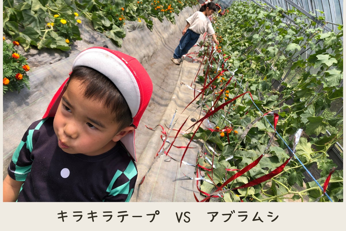 アブラムシはキラキラ光るものが苦手なので、今日はキラキラテープを飾る農業体験を企画。