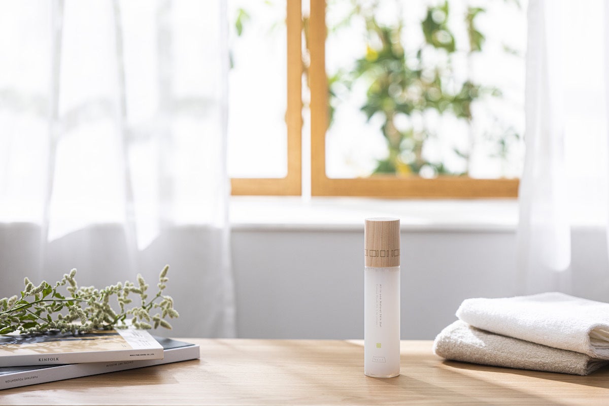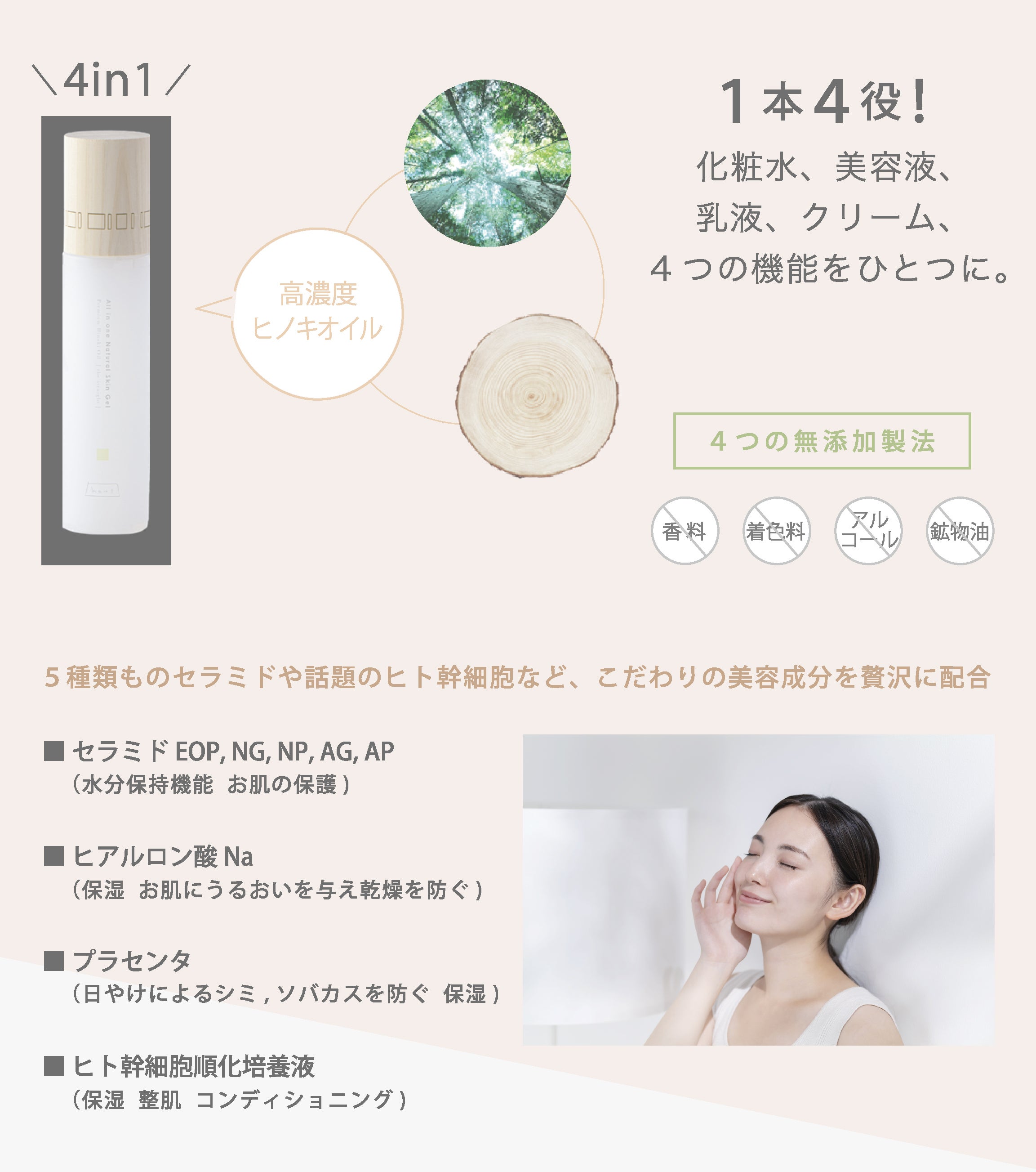 ヒアルロン酸と同様の保水力を持つ「プロテオグリカン」が長時間水分を肌内部にとどめ、さらにヒノキオイルが皮脂膜に近い役割をしてくれることで角質層を整え、肌のバリア機能(外的刺激から皮膚を保護する機能)を高めます。