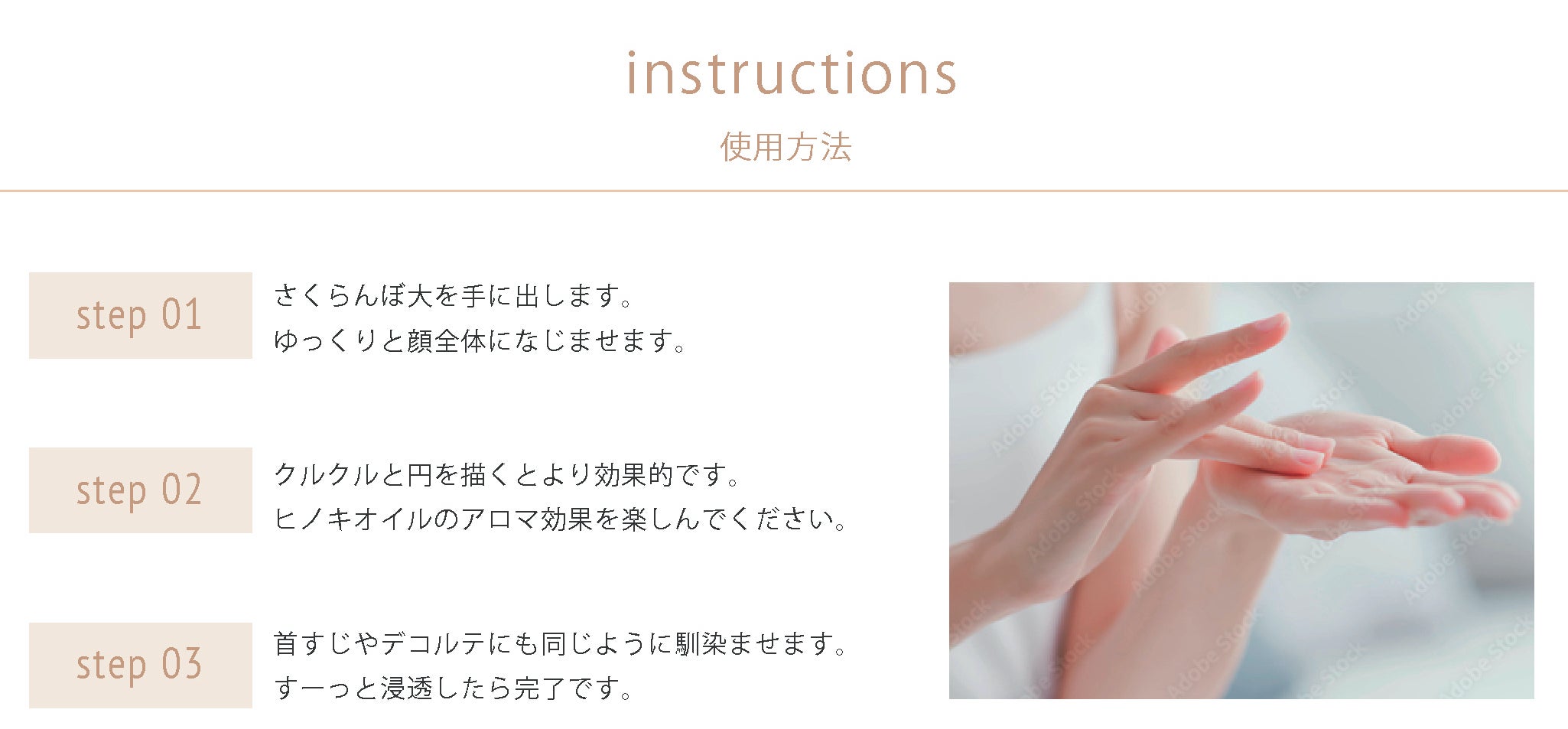 ヒノキオイルには乾燥で固くなったお肌を柔らかくしてくれるブースター機能があります。水分や美容成分の浸透(※)をサポートします。(※角質層まで)