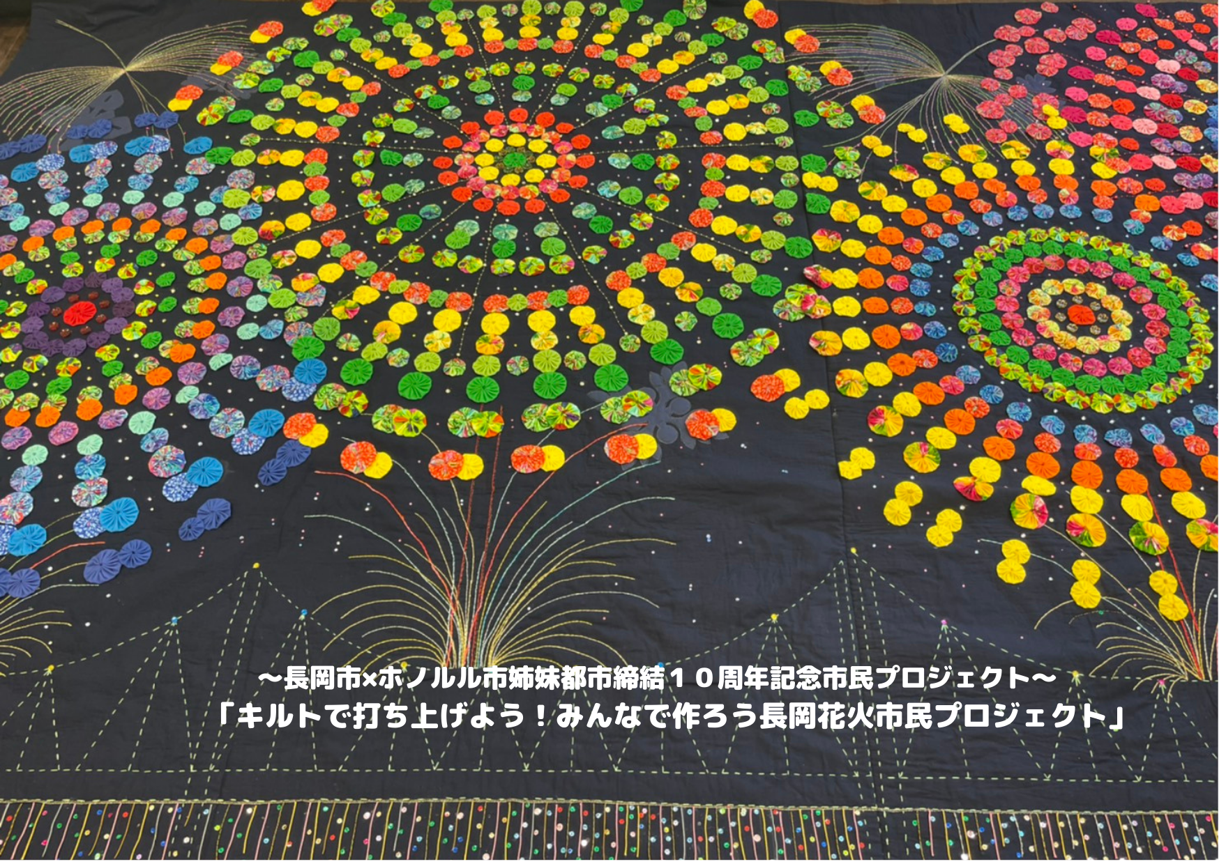 このプロジェクトは長岡市とホノルル市の姉妹都市の記念に行われ、長岡市が誇る長岡花火をイメージしたキルト作品を市民の皆さんと作り、これからの友好の証に毎年3月に開催されている『ホノルルフェスティバル』で毎年展示したいと始まった企画です。