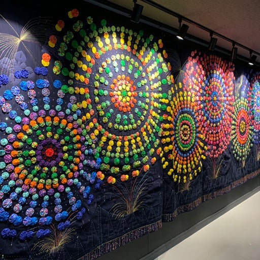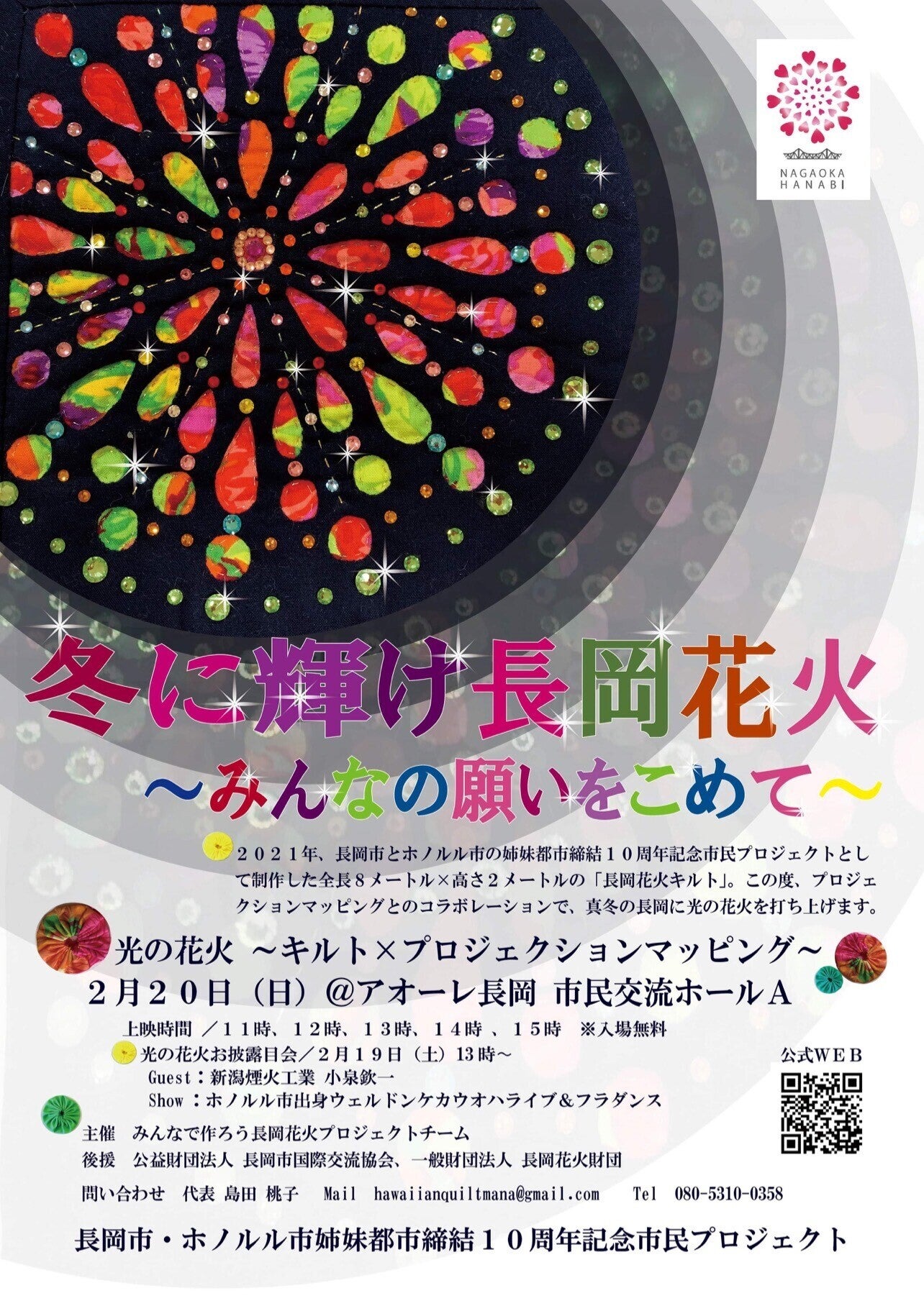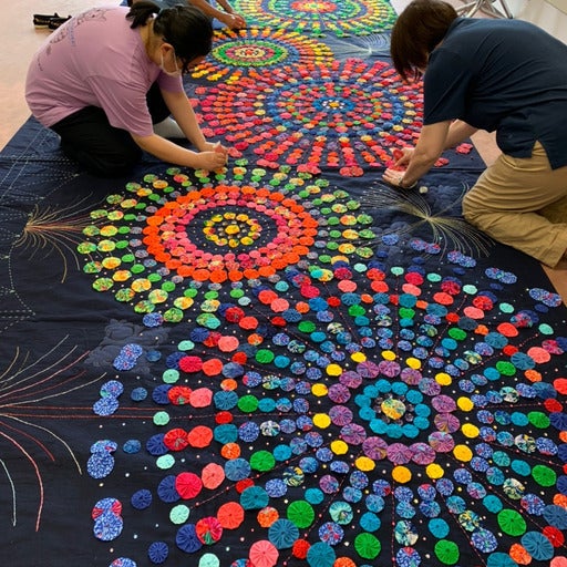 2022年3月、新潟県長岡市とホノルル市が姉妹都市10周年記念を迎えます。この記念に、市民プロジェクトとして行われた1万個のキルトをつなげた「長岡花火キルト」プロジェクトは、コロナ禍という厳しい中で行われましたが、縦2メートル×横8メートルという大きな長岡花火キルトが完成しました。