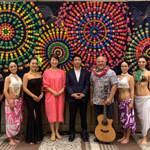 プロジェクトのイメージソングとして曲を使わせて頂いたホノルル市出身ウェルドン・ケカウオハ氏と新潟出身の奥様YUKOさんが作品の前で踊っていただきました。