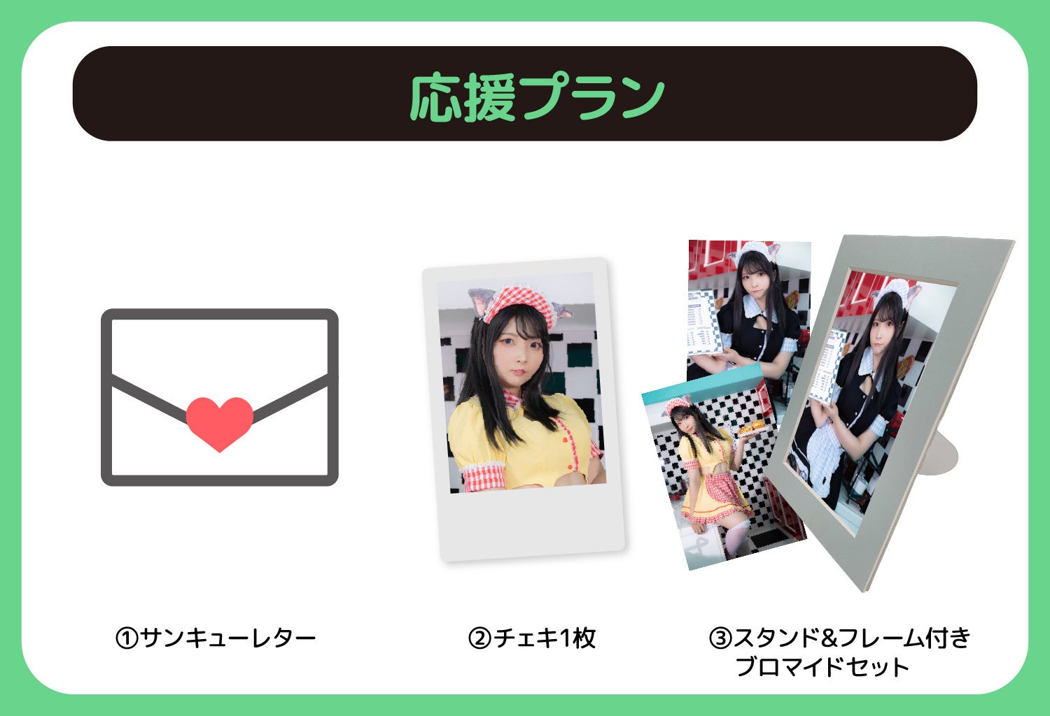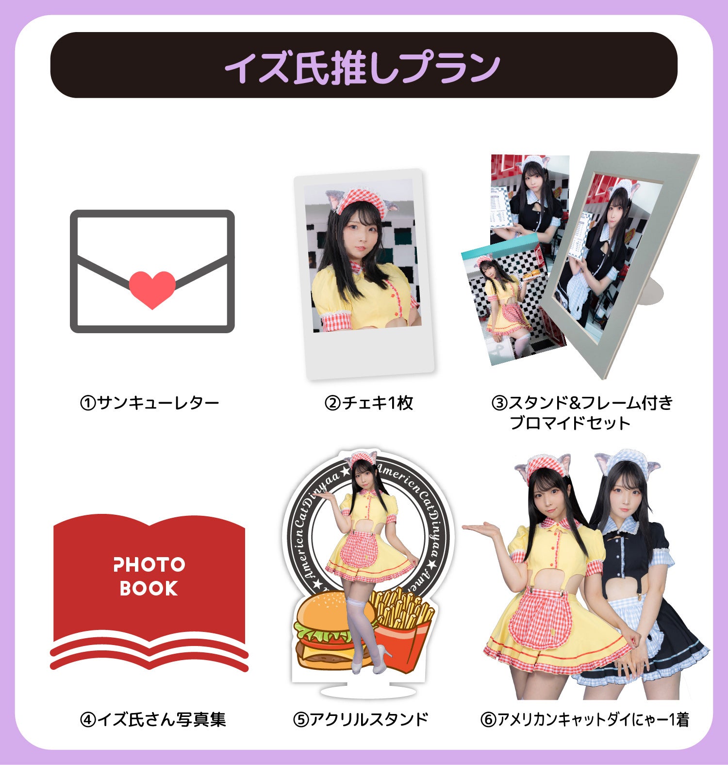 今回のプロジェクトのグッズが全て入ったリターンです。衣装はご自身で着用以外にもプレゼントにもオススメです。イズ氏さんを推しつつも衣装の可愛さをどんどん広めていきましょう!