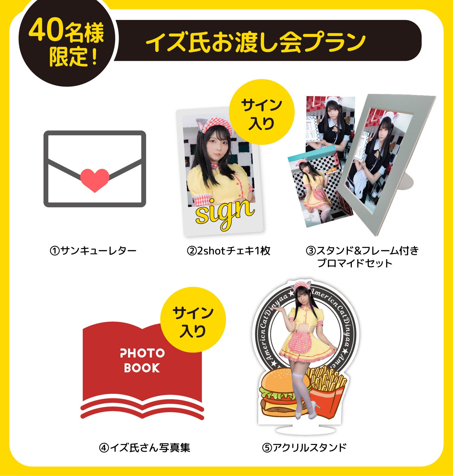 イズ氏さんに直接会ってリターンのお渡しを行うリターンです。その場での2ショットチェキ(サイン入り)やアメリカンキャットダイにゃーの写真集(サイン入り)がついた盛りだくさんな内容です。