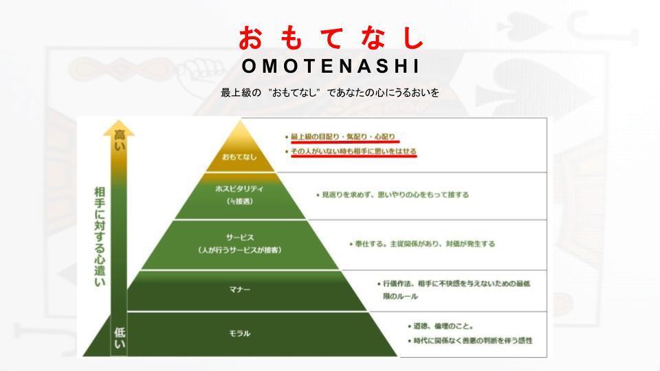 私たちはお客様に気持ちよく楽しんでいただき、満足の行く接客を提供したいという想いがあり、ホスピタリティーとは何か、満足の行くお店とは何かと言うものを考えました。