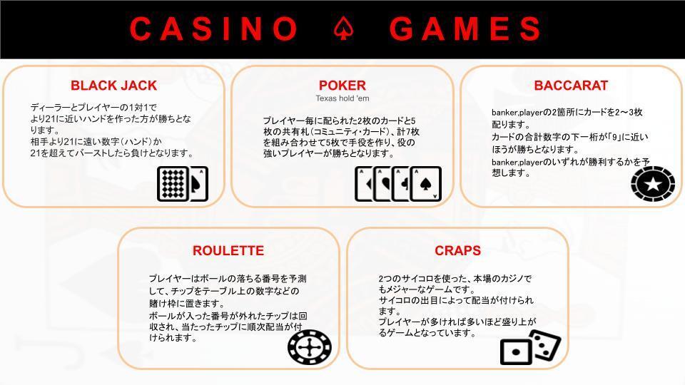 当店では、ポーカー、ブラックジャック、バカラを導入し、今後ルーレット、クラップスを増設していきます。