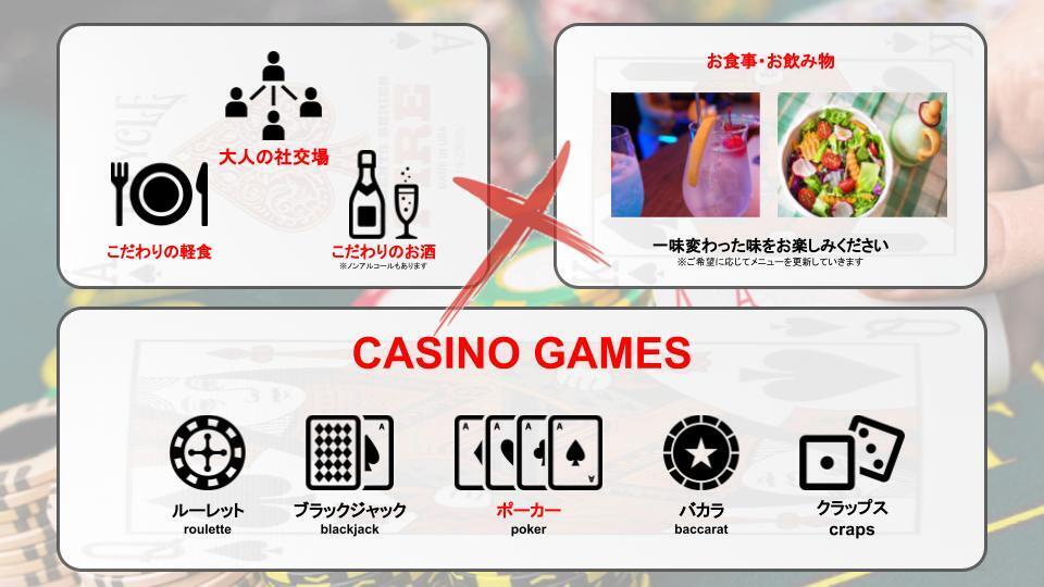 今回、アミューズメントカジノバーを設立することで、現在コロナの影響で下火にある各種業界、特に飲食店様ともタイアップし、飲食関係から底上げをしていきたい!!とも考えています。