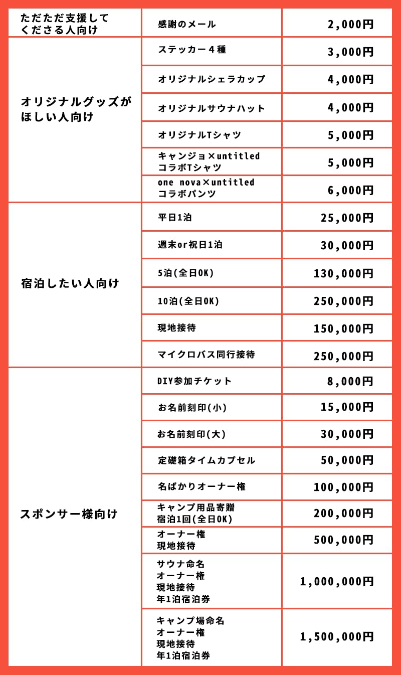 今回のプロジェクトでは、貸し切り予約チケットの他、untitledグッズやオリジナルキャンプ用品のリターンをご用意致しました!