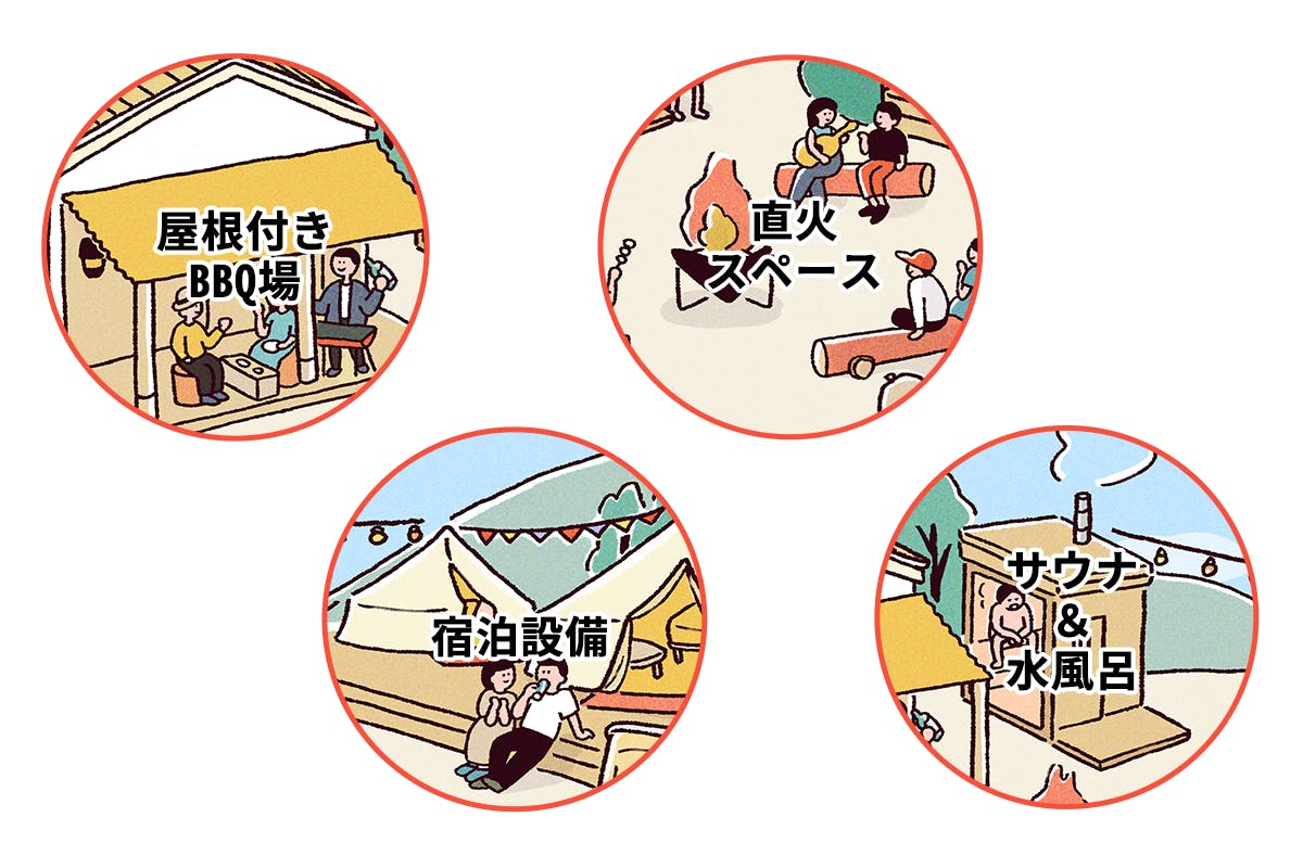 宿泊設備/屋根付きBBQ場/直火スペース/サウナ&水風呂。設備は常設、あとは楽しむだけ。