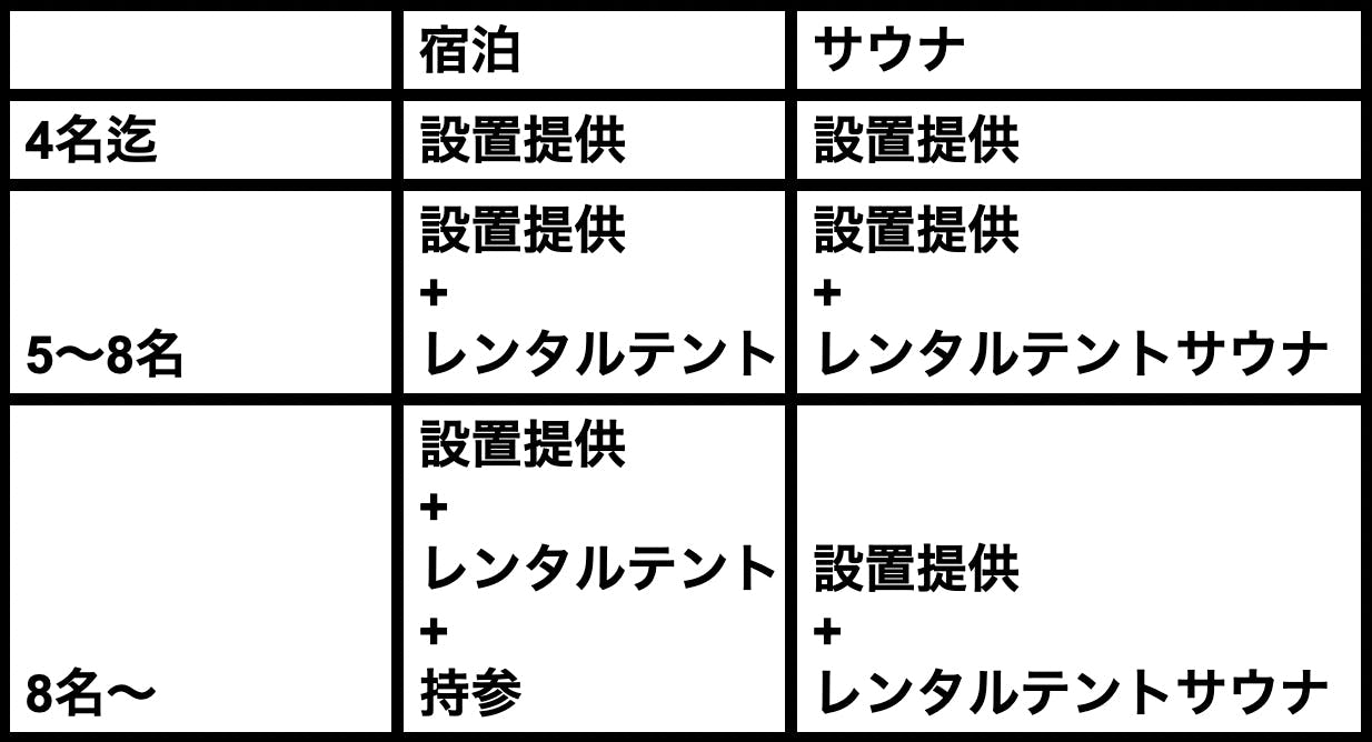 *5〜8名→別途オプション貸し出し(テント設営&テントサウナ設営)