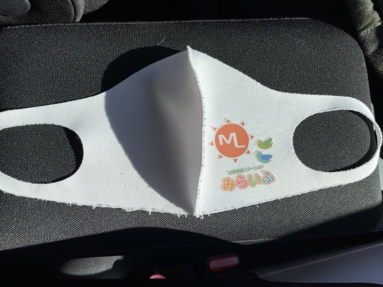 写真のようなみらいふのロゴ入りのマスクとお礼のメッセージのはがきを送ります。