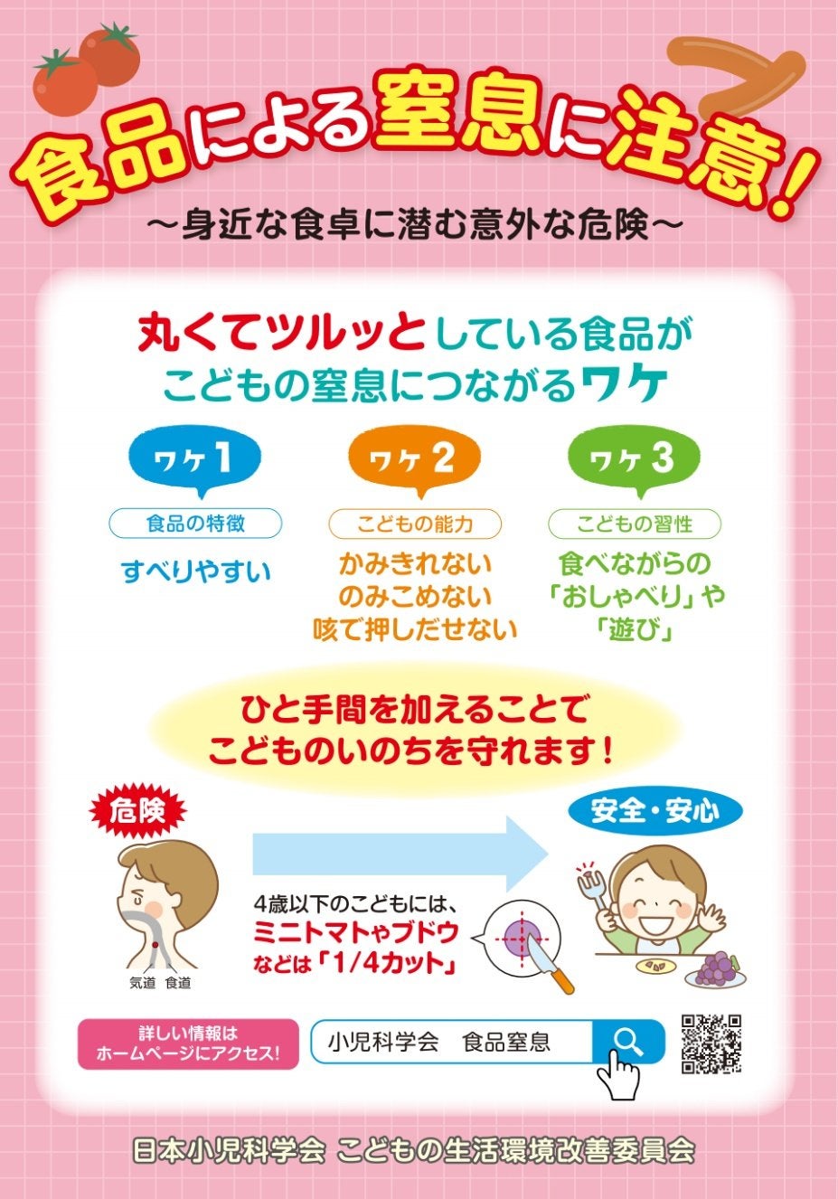 日本小児科学会が、2020年10月に「〜食品による窒息 子どもを守るためにできること〜」という提言を出しています。今回私たちは、この提言の内容をもとに、ミニトマトとぶどうの花火を上げました。