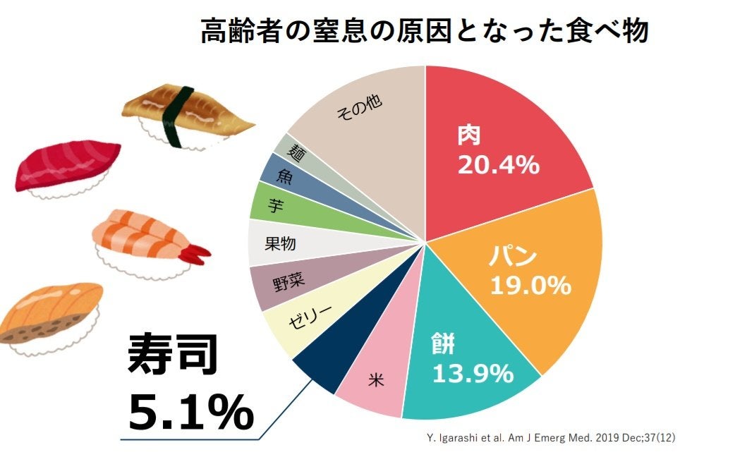 日本の約30施設が参加している異物による窒息に関する多施設共同研究「MOCHIプロジェクト」の研究結果によると、高齢者の窒息の原因の5番目に寿司があります。年末年始、ご家族やご友人とお寿司を囲む機会も増えると思いますので、少し気を付けてみてください。
