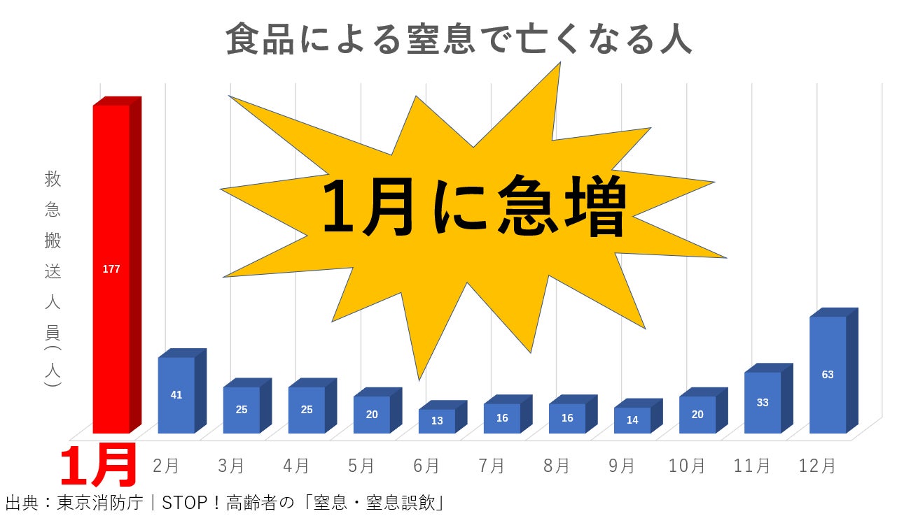 下図は、東京消防庁管内で救急搬送された 平成27年~令和元年中のデータを使用した、餅以外も含めた「食品による窒息で亡くなる人」のグラフで、1月の搬送人員が多くなっています。