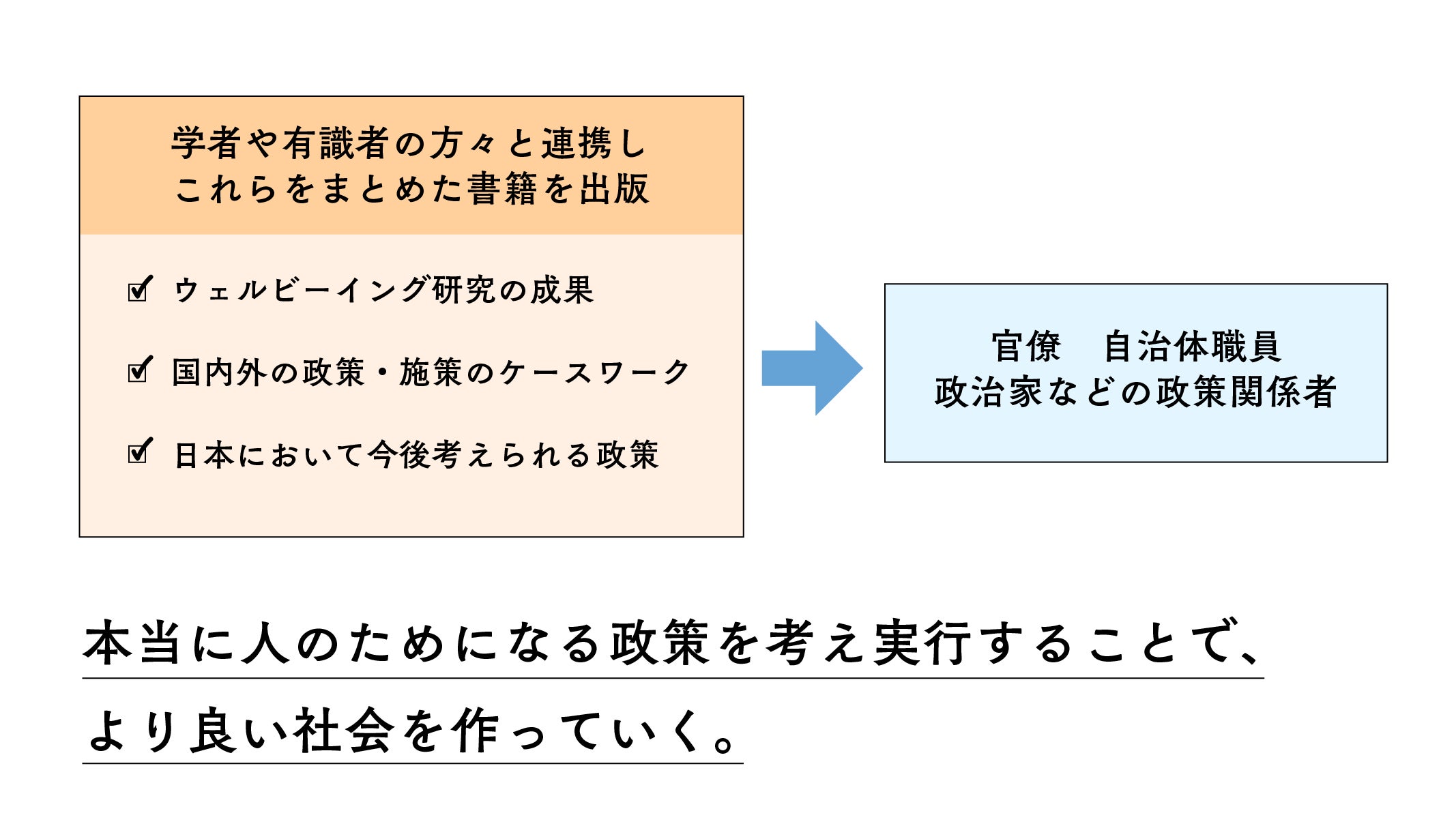 今回のプロジェクトは、官僚・自治体職員・政治家など政策関係者の方々向けに、現時点で明らかになっている人の幸せ(Well-Being)に関するエビデンスを整理した白書『政策関係者のための幸せ白書(仮)』を出版し、正確な情報を届けることで「より良い社会を作っていくこと」を目的にしています。