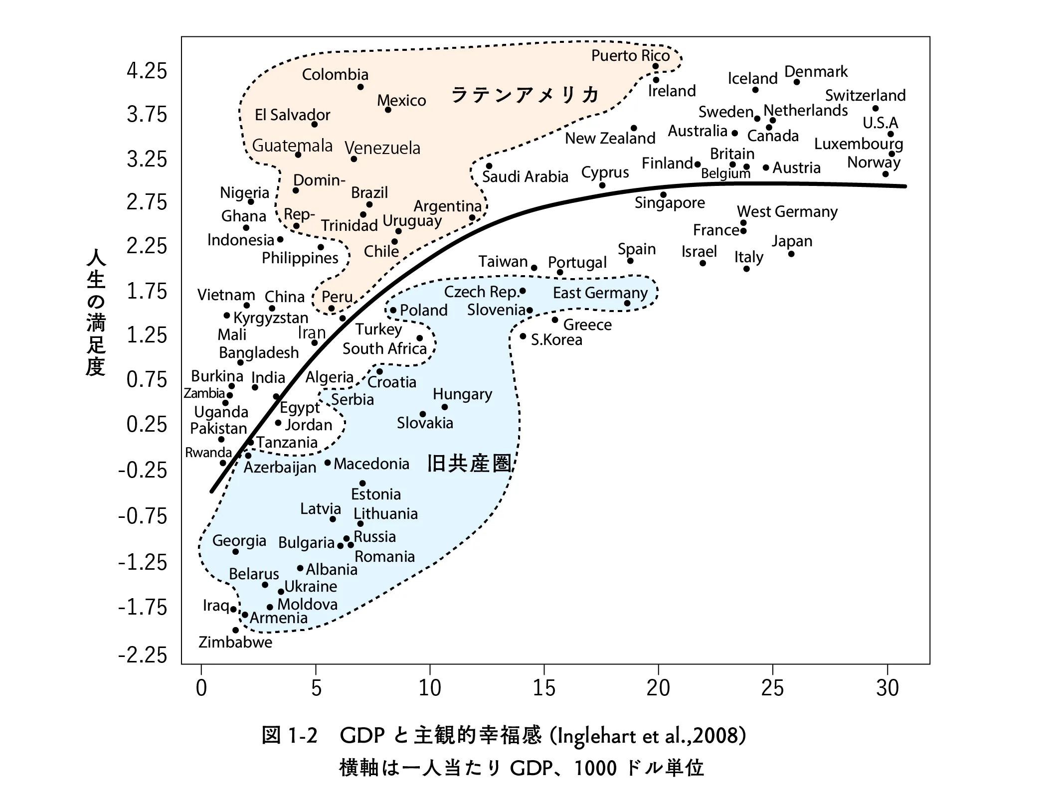 また、国別の1人あたりGDPと主観的幸福の関係を見ると、発展途上の段階では経済成長に相関するものの、ある程度経済が成長すると1人あたりGDPと主観的幸福の相関が弱くなっている事が分かります。