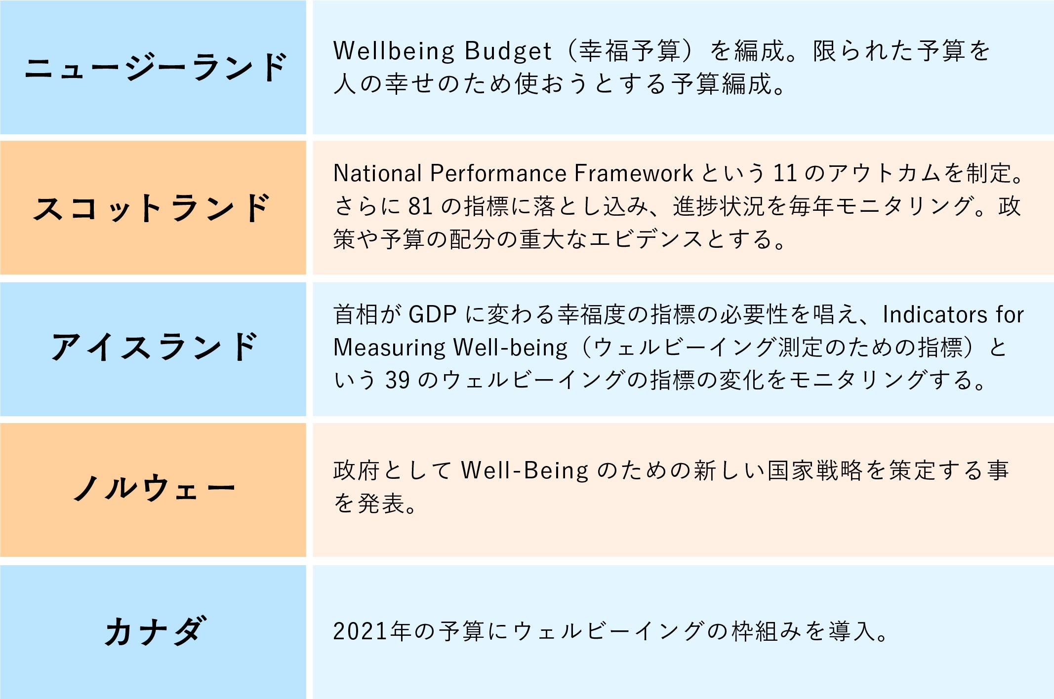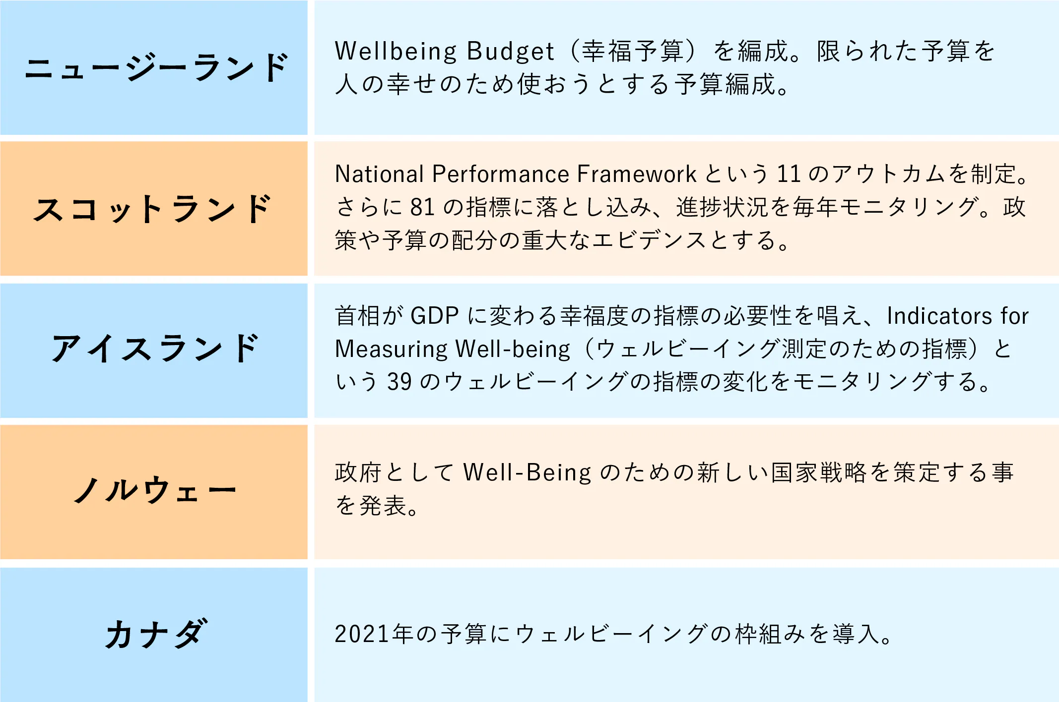 一人当たりGDPが、国や人々の豊かさを測る指標として万能ではないことが明らかになる一方、幸福に関する調査・研究が進んだことで、実際に諸外国ではWell-Beingを政策の中心に据える動きが加速しています。