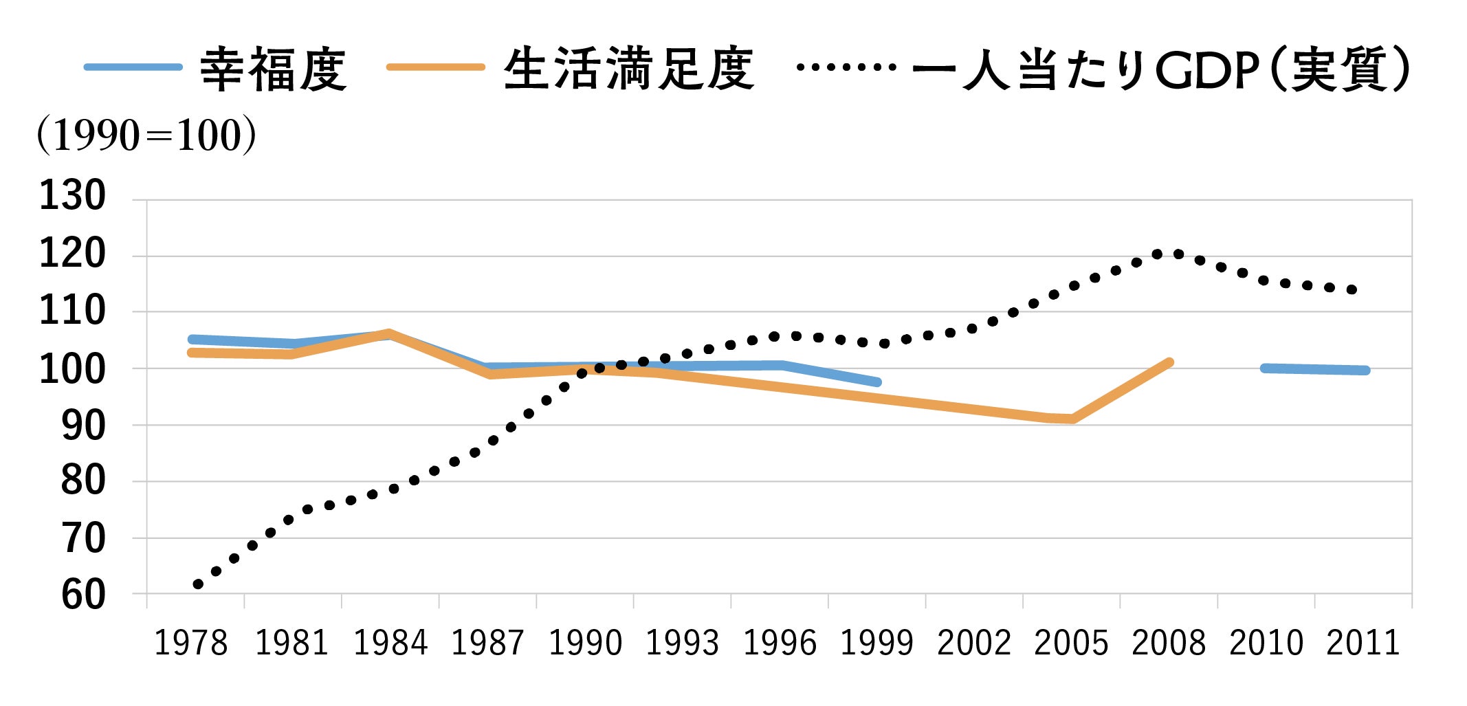実際、幸福度に関する調査を見てみると、日本はここ数十年、1人あたりGDPは伸びているものの、個人の主観的な幸福度は上がっていません。