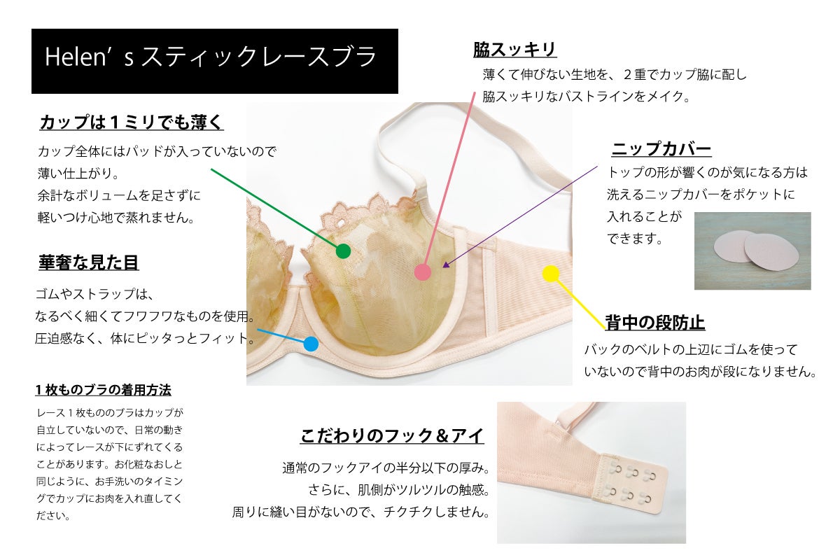 ララグラのブラは軽くて繊細なランジェリーライクな仕上がり。今回の商品は写真の通り、軽さを大事に開発しました。すっきりした見た目で気分も軽やかに!