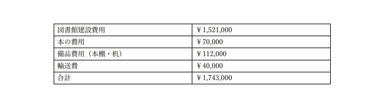 今回ご支援頂く支援金は、手数料・リターン費用を除いた金額を、全て図書館建設費用として使用させていただきます。