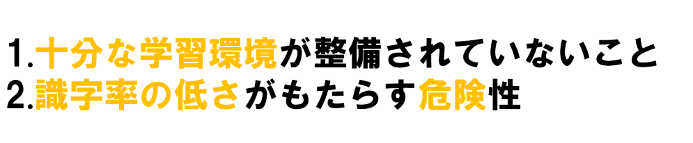 ・また、識字率の低さも問題となっています。識字能力の欠如が原因で、子どもたちが事故や事件に巻き込まれる危険性は大きく、不便や不安を抱えている子ども・その家族はたくさんいます。子どもたちを危険から守るためにも、識字率の向上はかなり重要です。