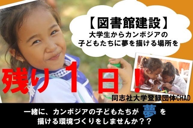 2022/04/29 22:303月18日に開始したクラウドファンディングも残すところ1日(終了日:4/30)となりました!私たちの目標金額は、1,800,000円。現在の総支援額は、439,500円。達成率は24%です。たくさんの準備と覚悟をもって、図書館建設に必要な費用のためにクラウドファンディングを開始しましたが、現在の達成率は目標金額には遠く及ばない状況です。カンボジアでの図書館建設が順調に進行しているなかで、現地の小学生に夢を与える環境をもたらすという私たちの夢は徐々に現実となりつつあります。しかし、たくさんの人たちの想いをのせて支援をするという私たちのもう一つの願いは、まだ完全に叶っていません。この活動に共感をして、カンボジアの子どもたちの未来をさらに明るいものにしたいと感じていただいた方達の思いを、私たちCHADメンバーの思いと一緒に現地に届けたいと思っています!これまでに支援をしていただいている方、本当にありがとうございます!みなさんの想いを汲み取り、一致団結して最後まで頑張ってなんとか目標金額を達成したいと思います!目標まで残り1,360,500円。果てしないように思うかもしれませんが、絶対に達成したいです!みなさま、最後まで応援よろしくお願いします! もっと見る