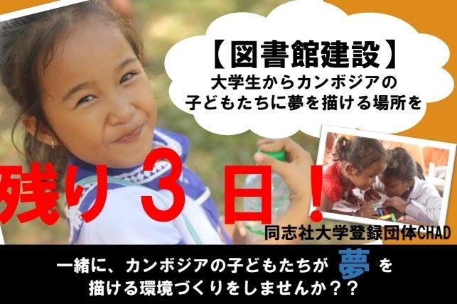 3月18日に開始したクラウドファンディングも残すところ2日(終了日:4/30)となりました!私たちの目標金額は、1,800,000円。現在の総支援額は、438,000円。達成率は24%です。たくさんの準備と覚悟をもって、図書館建設に必要な費用のためにクラウドファンディングを開始しましたが、現在の達成率は目標金額には遠く及ばない状況です。カンボジアでの図書館建設が順調に進行しているなかで、現地の小学生に夢を与える環境をもたらすという私たちの夢は徐々に現実となりつつあります。しかし、たくさんの人たちの想いをのせて支援をするという私たちのもう一つの願いは、まだ完全に叶っていません。この活動に共感をして、カンボジアの子どもたちの未来をさらに明るいものにしたいと感じていただいた方達の思いを、私たちCHADメンバーの思いと一緒に現地に届けたいと思っています!これまでに支援をしていただいている方、本当にありがとうございます!みなさんの想いを汲み取り、一致団結して最後まで頑張ってなんとか目標金額を達成したいと思います!目標まで残り1,362,000円。果てしないように思うかもしれませんが、絶対に達成します。みなさま、最後まで応援よろしくお願いします!く