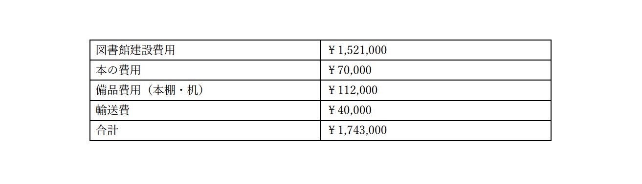 今回ご支援頂く支援金は、手数料・リターン費用を除いた金額を、全て図書館建設費用として使用させていただきます。