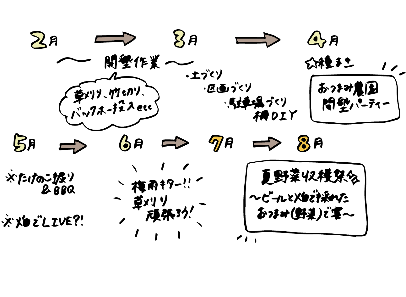 ▼おつまみ農園開墾~収穫祭までのざっくりカレンダー