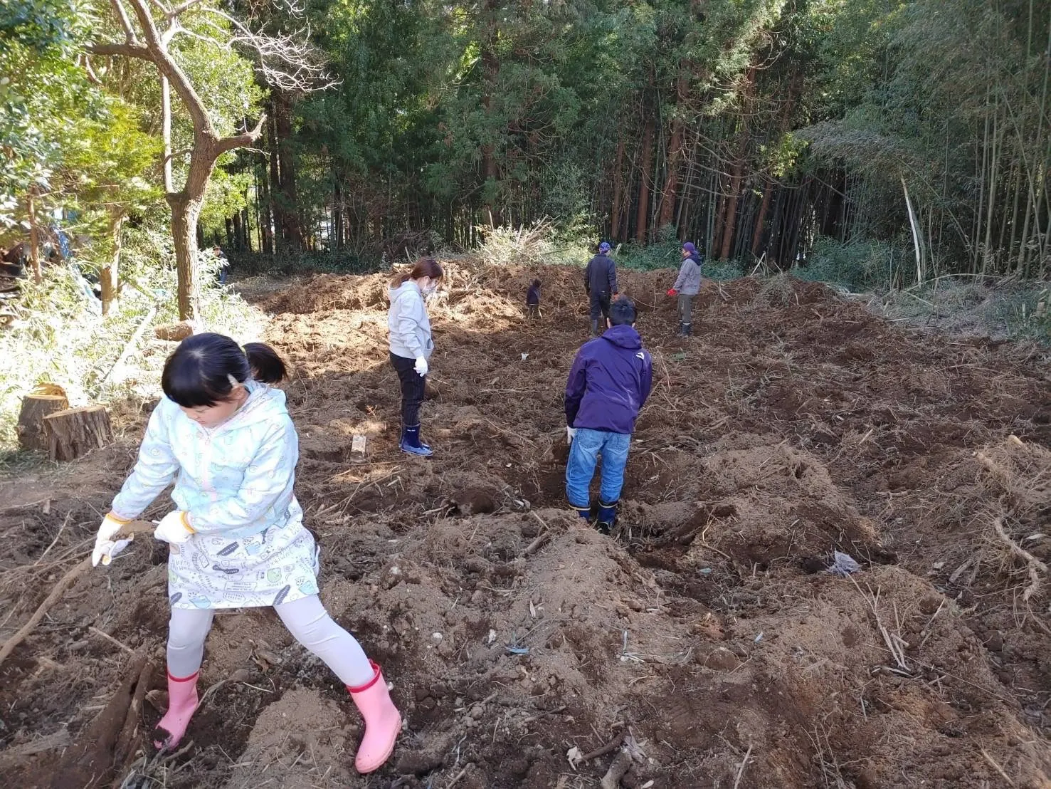 今日はバックホーで掘り起こした竹の根を引っこ抜く作業。子供たちもお手伝いをしに来てくれて、わいわい楽しい開墾風景でした。