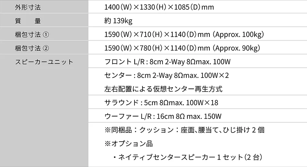自宅に同じ環境を整えようとすると部屋の防音工事、アンプ、スピーカー×24台、分配器・・・と高級外車1台分相当の出費が伴います。本製品は椅子に防音対策、スピーカー×24台を収めたことにより、自宅環境を損なうことなく、リーズナブルに理想的な音響空間を作り出すことが可能になりました。
