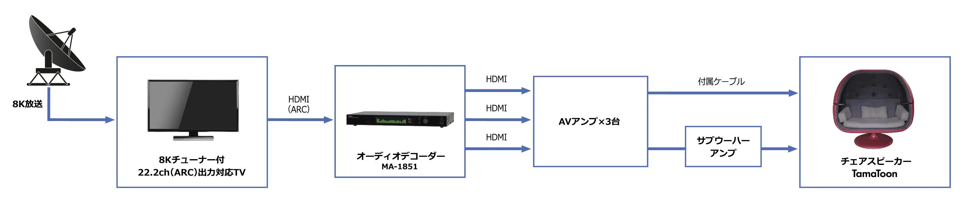 ※TamaToonで音を鳴らすためには、増幅器であるアンプが3台と、各アンプに音を振り分けるオーディオデコーダーが必要となります。