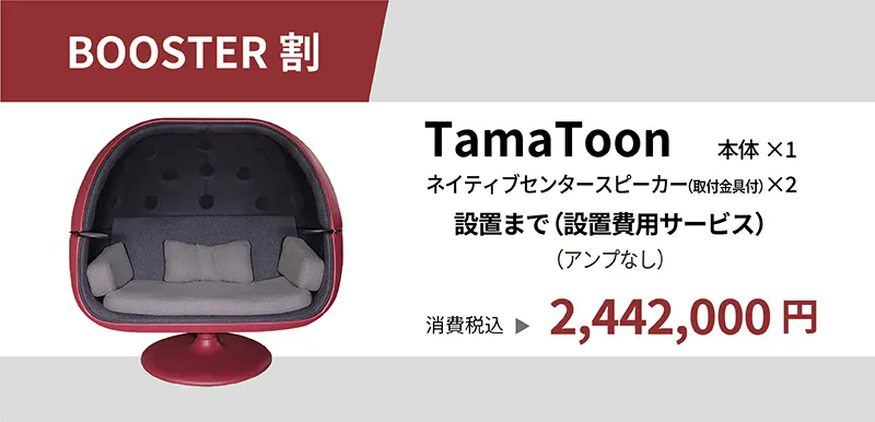 「TamaToon」は、シェル型の椅子にその優れた音響特性を生かすために、クオリティーの高い専用設計のスピーカー・ネットワークを構築していますので、置きたい場所に設置するだけです。