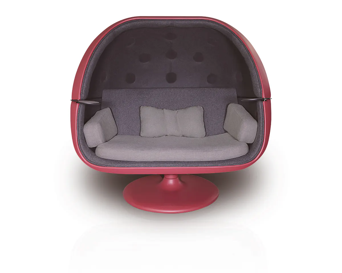 その解決策はシェルに収めることにあったのです。近未来的なデザインの「ボールチェア」を参考にシェル型にすることで遮音効果や吸音効果が見込め、この中で映画音響が再現できるほどのスピーカーを付けたら素晴らしいサラウンドが聞こえるイスになりました。
