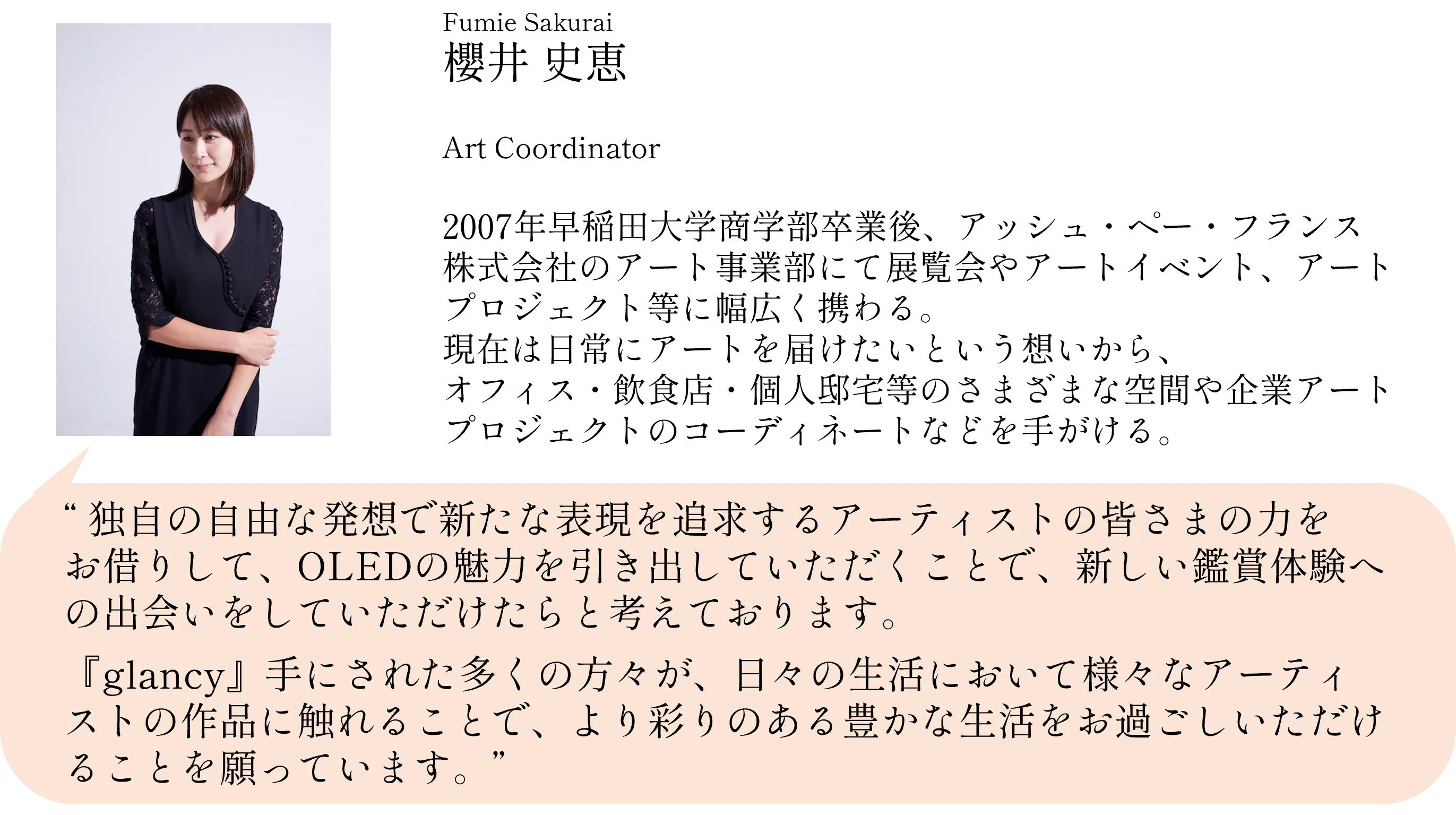 今回、glancyの開発チームに アートコーディネーターの櫻井史恵 氏がご参画いただいております。