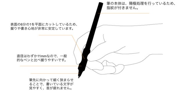 アルミ合金製のペン本体の総重量はわずか18.8g。軽くて扱いやすく、手首に負担がかかりません。また表面処理(表面に酸化アルミニウム皮膜を生成させる処理)を施しているため、耐食性が上がり、硬質化し、耐摩耗性も向上するため、指紋や引っ掻き傷などが付きにくいです。
