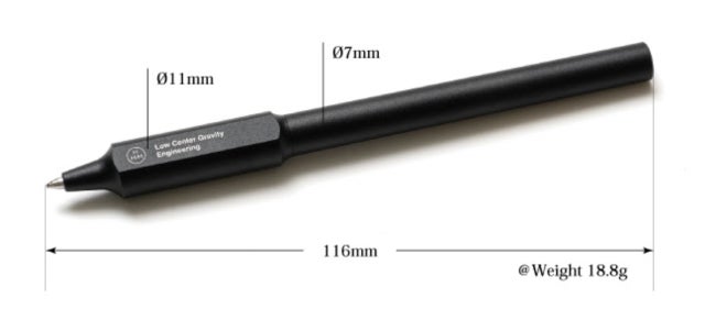 「Plummet Ballpoint」は通常の金属ペンとは異なり、直径が小さく軽量なデザイン。ペン本体の総重量は18.8gで、バレルの直径は7mm、ペングリップの直径は11mmです。手が小さい女性でも、やさしい筆記体験が楽しめます。