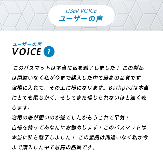 ゆっくりお風呂時間を楽しめる商品をさがしていたところドイツのマットレスメーカーに出会いました。BATHPADを敷いて入るととても気持ち良く、リラックスタイムを感じることができます。安定感がありゆっくり入浴できます。この懐疑的な体験はまさに雲の上のお風呂です。