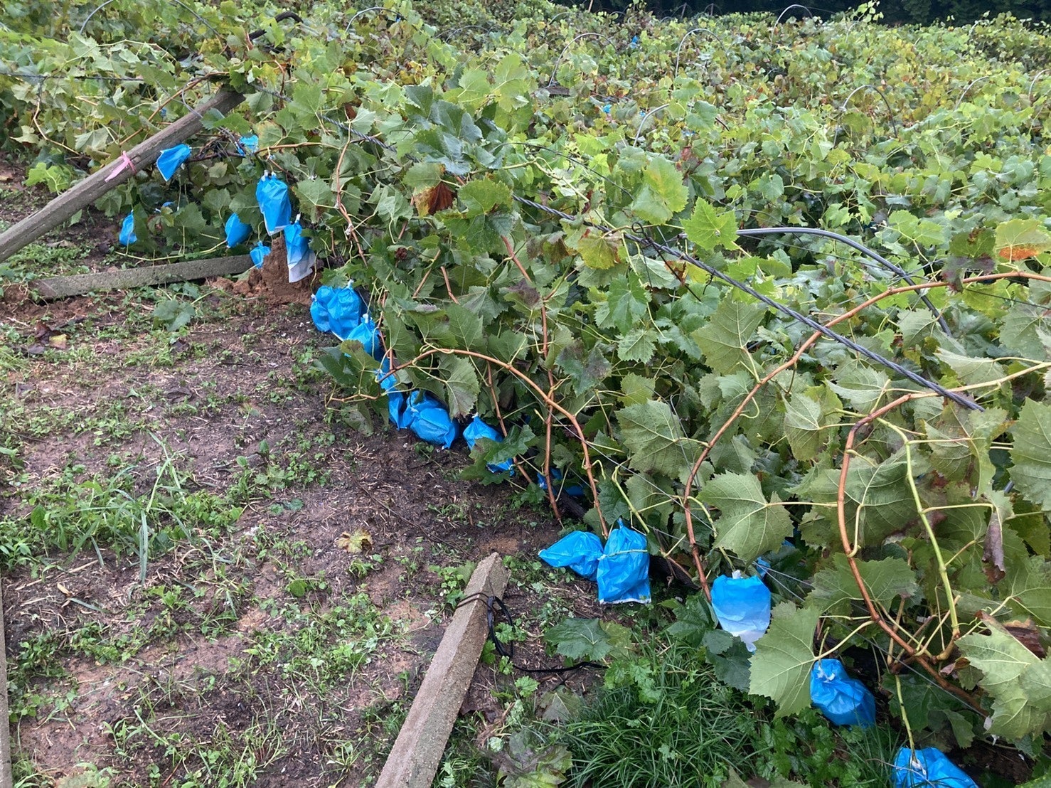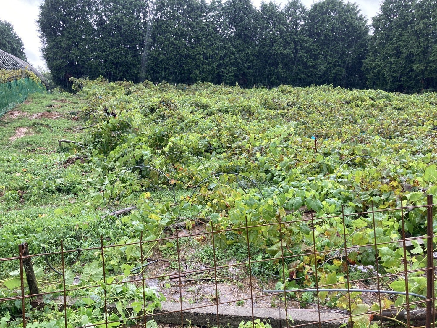 2021年8月のお盆のぶどうがちょうど旬を迎えた頃、稀に見る豪雨,長雨によってぶどう棚が倒壊し、ぶどうの樹々は倒れ収穫直前のぶどう達(シャインマスカット・ピオーネ)が樹ごと地面に落ちてしまいました。
