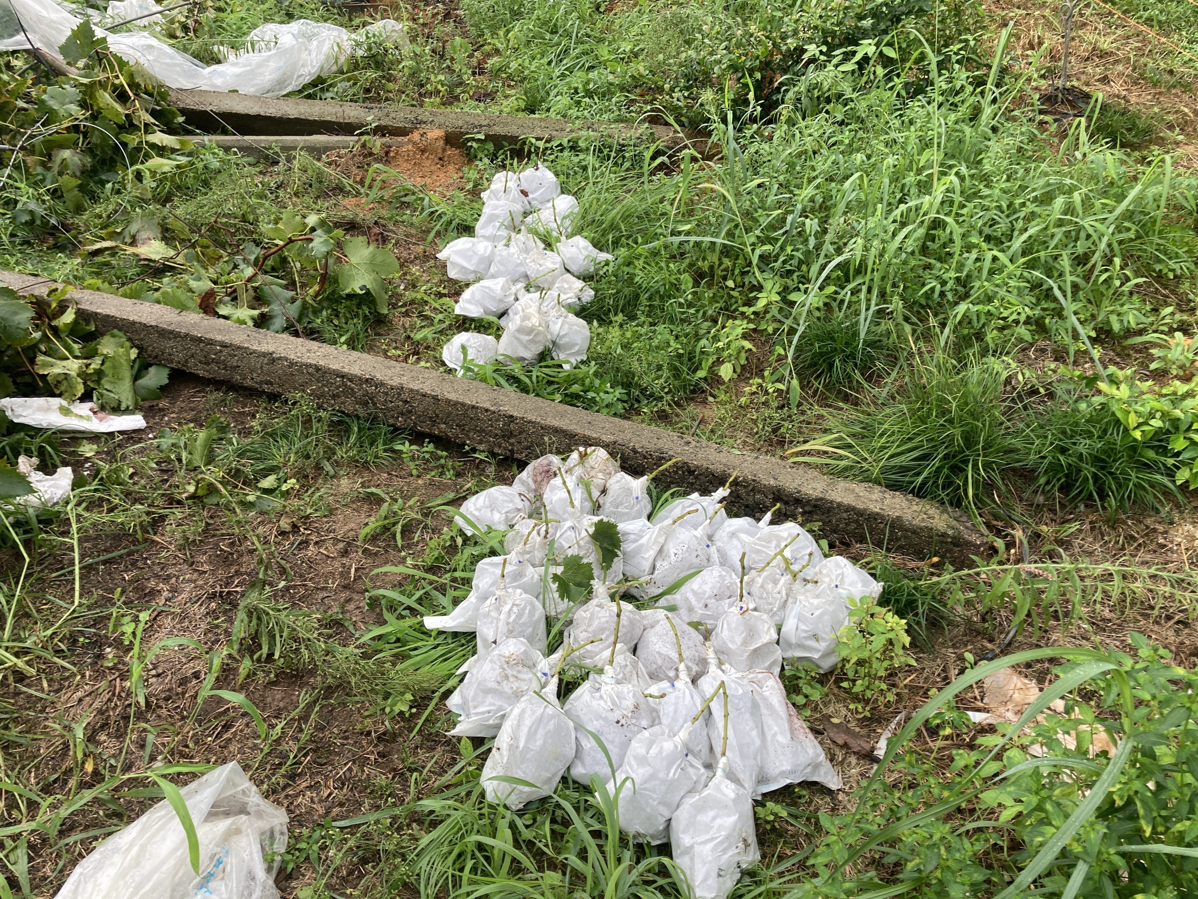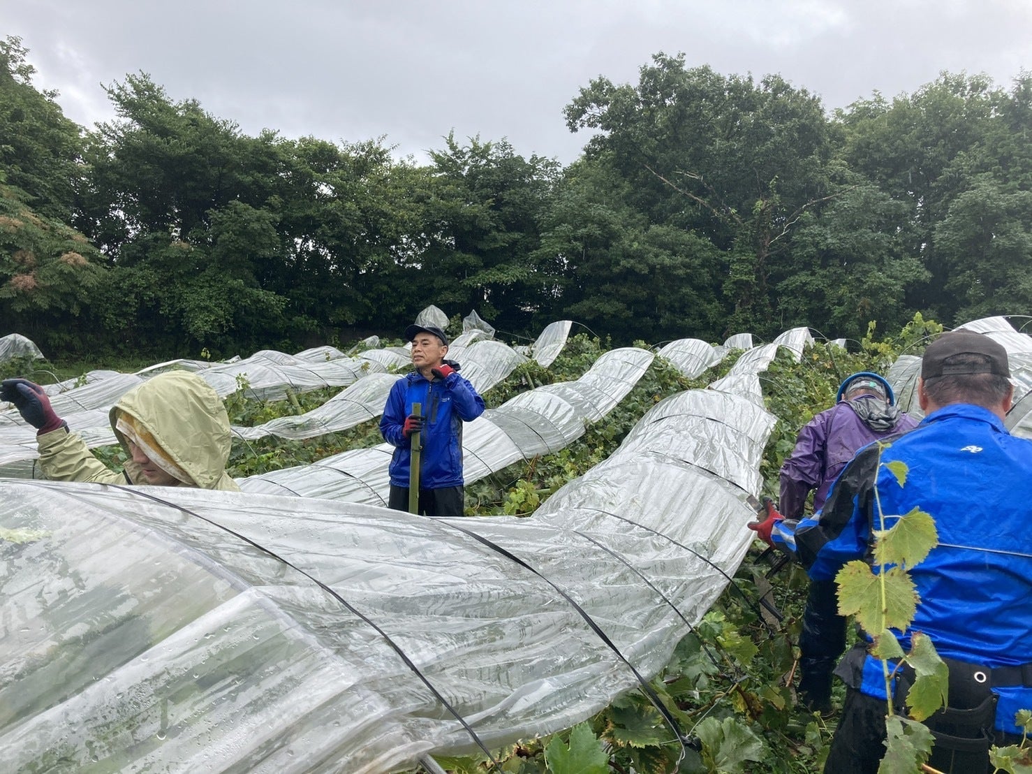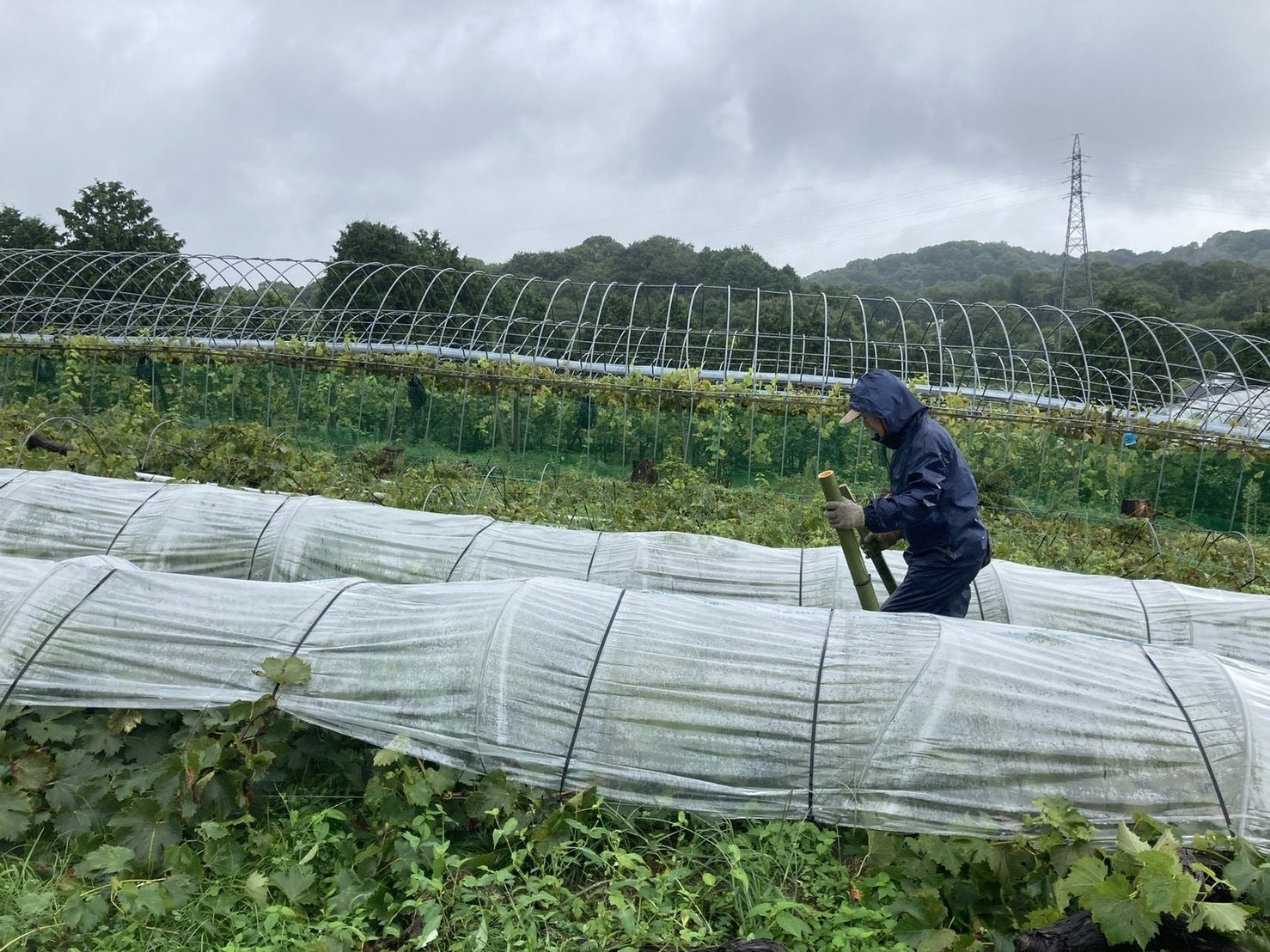 ぶどうを地面から浮かせる事が出来れば腐らず訳あり品としてでも売り物になるため、家族総出で裏山の竹を切り出し枝の持ち上げを開始しましたが、被害が合計3000㎡もの広範囲でしたので絶望の淵に立たされた気持ちで当時は作業しておりました。