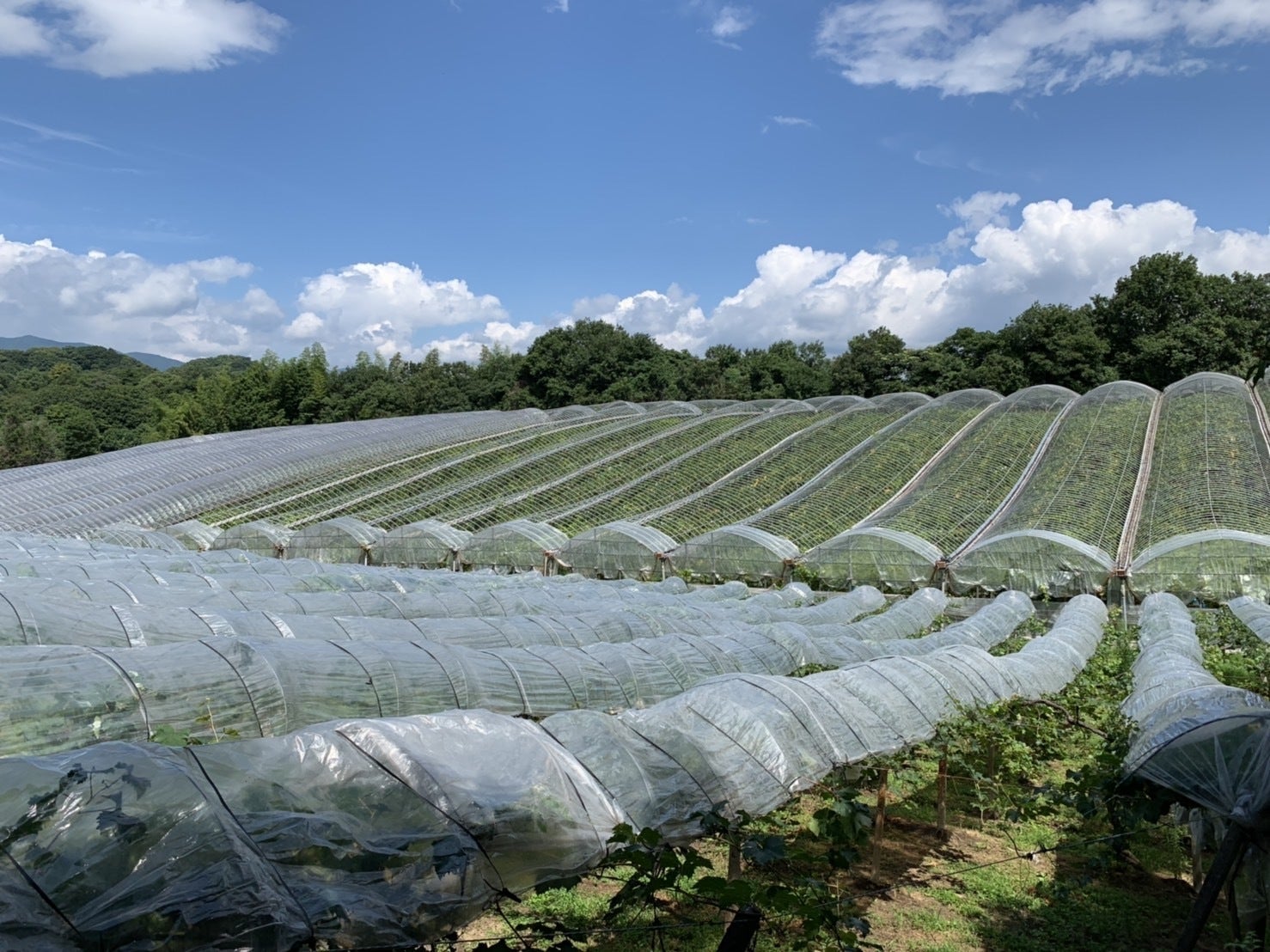 山の斜面に建つビニールハウスまた、山の斜面をぶどう畑にしたことで日当たりや水はけが良く、井戸のミネラル豊富な水で栽培されるぶどうは食べた方から「コクがあり美味しい」と地域の方々に愛され支えられ、今日まで農園を続けることが出来たと思っています。