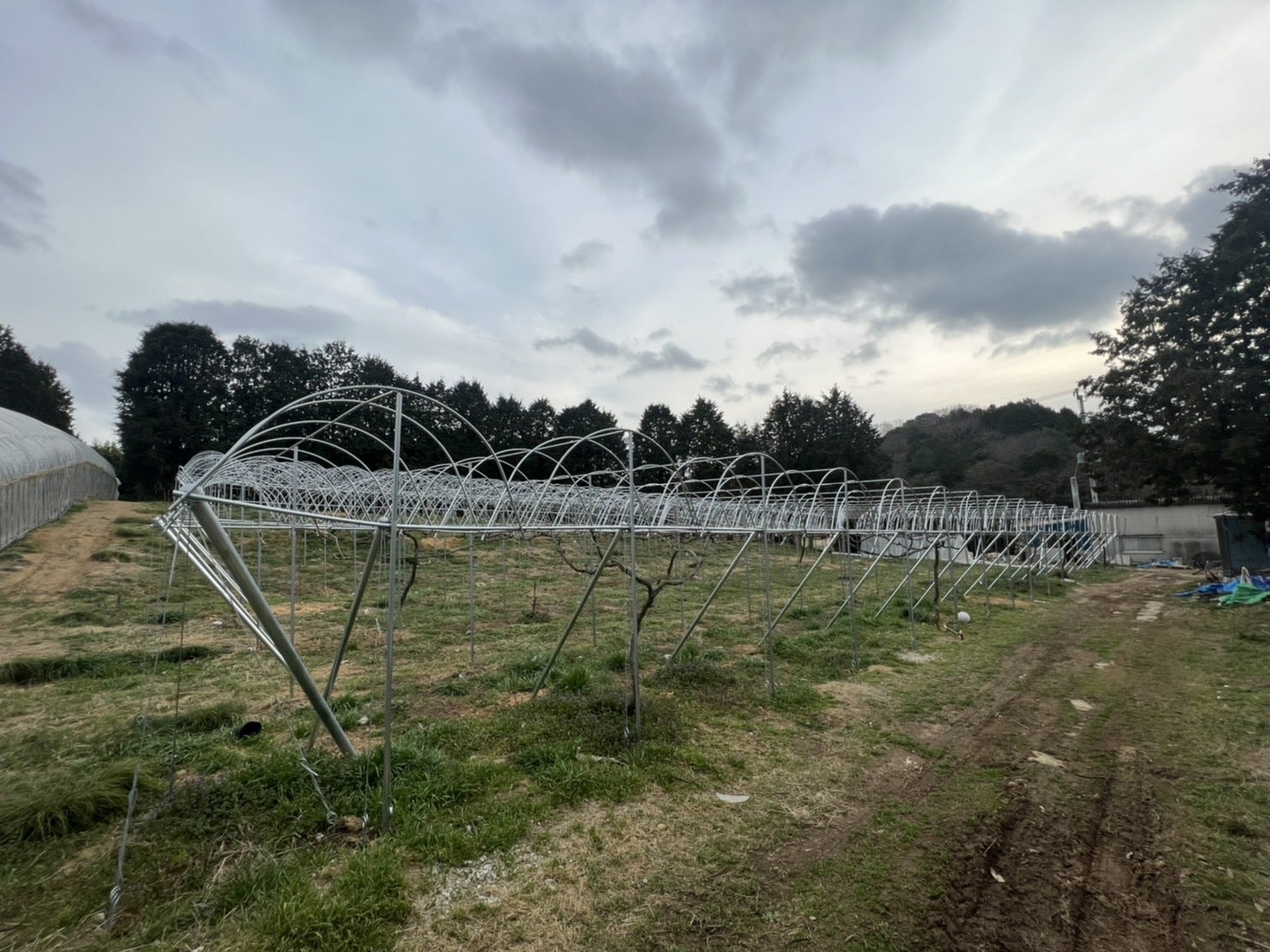こんにちは!クラウドファンディングから3週間、沢山のご支援ありがとうございました。おかげさまで予定よりも少し早くぶどう棚が完成しました。ご担当頂いた業者さん、職人さんもありがとうございました!樹達も7か月ぶりに地面から離れることができ喜んでいる様にみえます。どれだけ芽吹いてくれるか不安ですが、きっと美味しいぶどうが実ってくれるでしょう。このあと、アーチに雨除けのビニールをかけていきます。上の写真は左がシャインマスカット、右がピオーネの棚なんですが違いがあり、シャインマスカットはトンネルのアーチに隙間がなくて、ピオーネは80センチくらい開けています。理由はピオーネは雨に弱く収穫までずっとビニールをしたままにしておくので、隙間がないと雨水が入らず水が不足してしまうとの事です。今後は遅れている芽傷処理や草刈りをしていき、夏には美味しいぶどうをお届けできるように頑張りますので、引き続き応援よろしくお願いいたします!