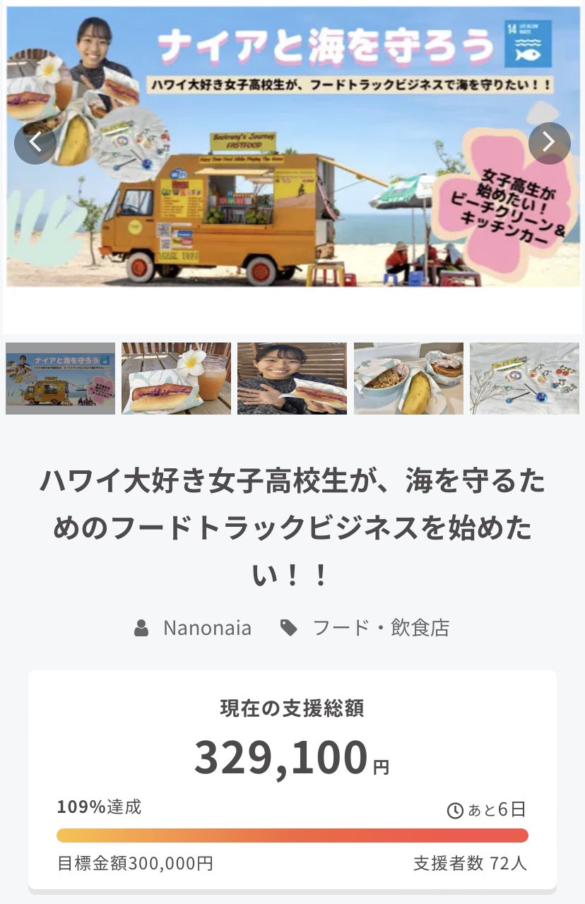 こんにちは、Naiaです。先日公開したプロジェクトですが、只今の達成率は41%です。目標達成にはまだまだ皆様の支援が必要なので、新しいリターンをご用意しました!ナイアとお話できるオンラインイベントや、500円から支援できるちょこっと応援型など、様々あります。日々、キッチンカーの計画を立てたり、ビーチクリーンについて説明を聞きに行ったり、着々と準備を進めています。ご家族の方やお友達も誘って一緒に活動しませんか?朝の涼しい時間にビーチクリーンをして、すっきりした気持ちで一日を始められそう♡さらに綺麗になった海を見ながらハワイアンホットドッグを食べればまるでハワイのビーチにいるような気分になれます!マイクロプラスチックで作るカラフルなアクセサリーを想像しながらのビーチクリーンは、宝探しのようですよね!ぜひ、またやりたい!と思えるビーチクリーンイベントを一緒に開催しましょう!1度支援した方も何度でもできます。支援しようか迷っている方、楽しいイベントが待っています。地球の環境について学ぶこともできます。ぜひご協力よろしくお願いします!Naia